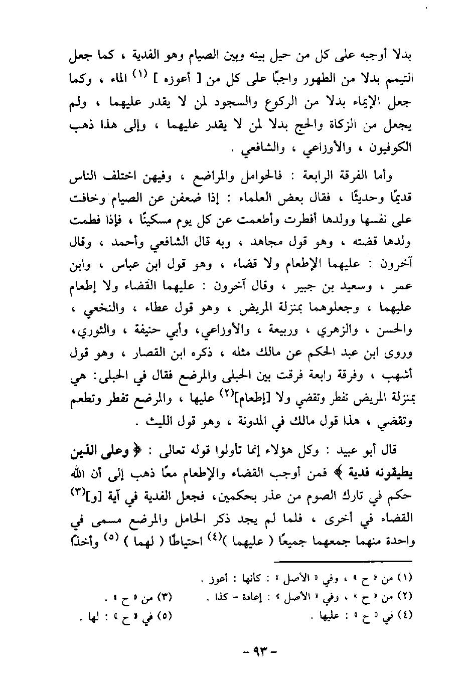 بدلا أوجبه على كل من حيل بينه وبين الصيام وهو الفدية، كما جعل التيمم بدلا من الطهور واجبًا على كل من أعوزه الماء، وكما جعل الإيماء بدلا من الركوع والسجود لمن لا يقدر عليهما، ولم يجعل من الزكاة والحج بدلا لمن لا يقدر عليهما، وإلى هذا ذهب الكوفيون، والأوزاعى، والشافعى. وأما الفرقة الرابعة: فالحوامل والمراضع، وفيهن اختلف الناس قديمًا وحديثًا، فقال بعض العلماء: إذا ضعفن عن الصيام وخافت على نفسها وولدها أفطرت وأطعمت عن كل يوم مسكينًا، فإذا فطمت ولدها قضته، وهو قول مجاهد، وبه قال الشافعى وأحمد، وقال آخرون: عليهما الإطعام ولا قضاء، وهو قول ابن عباس، وابن عمر، وسعيد بن جبير، وقال آخرون: عليهما القضاء ولا إطعام عليهما، وجعلوهما بمنزلة المريض، وهو قول عطاء، والنخعى، والحسن، والزهرى، وربيعة، والأوزاعى، وأبى حنيفة، والثورى، وروى ابن عبد الحكم عن مالك مثله، ذكره ابن القصار، وهو قول أشهب، وفرقة رابعة فرقت بين الحبلى، والمرضع فقال فى الحبلى: هى بمنزلة المريض تفطر وتقضى ولا إطعام عليها، والمرضع تفطر وتطعم وتقضى، هذا قول مالك فى المدونة، وهو قول الليث. قال أبو عبيد: وكل هؤلاء إنما تأولوا قوله تعالى: (وَعَلَى الَّذِينَ يُطِيقُونَهُ فِدْيَةٌ (فمن أوجب القضاء والإطعام معًا ذهب إلى أن الله حكم فى تارك الصوم من عذر بحكمين، فجعل الفدية فى آية والقضاء فى أخرى، فلما لم يجد ذكر الحامل والمرضع مسمى فى واحدة منهما جمعهما جميعًا عليهما احتياطًا لهما وأخذًا
