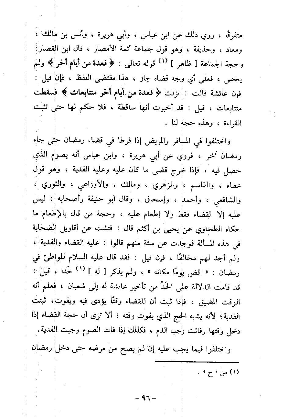 متفرقًا، روى ذلك عن ابن عباس، وأبى هريرة، وأنس بن مالك، ومعاذ، وحذيفة، وهو قول جماعة أئمة الأمصار، قال ابن القصار: وحجة الجماعة ظاهر قوله تعالى: (فَعِدَّةٌ مِنْ أَيَّامٍ أُخَرَ (ولم يخص، فعلى أى وجه قضاه جاز، هذا مقتضى اللفظ، فإن قيل: فإن عائشة قالت: نزلت) فَعِدَّةٌ مِنْ أَيَّامٍ أُخَرَ (متتابعات، فسقطت متتابعات، قيل: قد أخبرت أنها ساقطة، فلا حكم لها حتى تثبت القراءة، وهذه حجة لنا. واختلفوا فى المسافر والمريض إذا فرطا فى قضاء رمضان حتى جاء رمضان آخر، فروى عن أبى هريرة، وابن عباس أنه يصوم الذى حصل فيه، فإذا خرج قضى ما كان عليه وعليه الفدية، وهو قول عطاء، والقاسم، والزهرى، ومالك، والأوزاعى، والثورى، والشافعى، وأحمد، وإسحاق، وقال أبو حنيفة وأصحابه: ليس عليه إلا القضاء فقط ولا إطعام عليه، وحجة من قال بالإطعام ما حكاه الطحاوى عن يحيى بن أكثم قال: فتشت عن أقاويل الصحابة فى هذه المسألة فوجدت عن ستة منهم قالوا: عليه القضاء والفدية، ولم أجد لهم مخالفًا، فإن قيل: فقد قال عليه السلام للواطئ فى رمضان: (اقض يومًا مكانه) ، ولم يذكر له حَدا، قيل: قد قامت الدلالة على الحَدِّ من تأخير عائشة له إلى شعبان، فعلم أنه الوقت المضيق، فإذا ثبت أن للقضاء وقتًا يؤدى فيه ويفوت، ثبتت الفدية، لأنه يشبه الحج الذى يفوت وقته، ألا ترى أن حجة القضاء إذا دخل وقتها وفاتت وجب الدم، فكذلك إّا فات الصوم وجبت الفدية. واختلفوا فيما يجب عليه إن لم يصح من مرضه حتى دخل رمضان