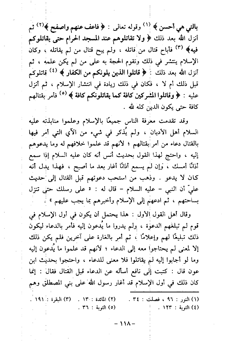 بالتى هى أحسن (وقوله تعالى: (فاعف عنهم واصفح (ثن أنزل الله بعد ذلك: (ولا تقاتلوهم عند المسجد الحرام حتى يقاتلوكم فيه (فأباح قتال من قاتله، ولم يبح قتال من لم يقاتله، وكان الإسلام ينتشر فى ذلك وتقوم الحجة به على من لم يكن علمه، ثم أنزل الله بعد ذلك: (قاتلوا الذين يلونكم من الكفار (قاتلوكم قبل ذلك أم لا، فكان فى ذلك زيادة فى انتشار الإسلام، ثم أنزل عليه: (وقاتلوا المشركين كافة كما يقاتلونكم كافة (فأمر بقتالهم كافة حتى يكون الدين كله لله. وقد تقدمت معرفة الناس جميعًا بالإسلام وعلموا منابذته (صلى الله عليه وسلم) أهل الأديان، ولم يذكر فى شيء من الآى التى أمر فيها بالقتال دعاء من أمر بقتالهم؛ لأنهم قد علموا خلافهم له وما يدعوهم إليه، واحتج لهذا القول بحديث أنس أنه كان (صلى الله عليه وسلم) إذا سمع أذانًا أمسك، وإن لم يسمع أذانًا أغار بعد ما أصبح، فهذا يدل أنه كان لا يدعو. وذهب من استحب دعوتهم قبل القتال إلى حديث على أن النبى (صلى الله عليه وسلم) قال له: (على رسلك حتى تنزل بساحتهم، ثم ادعهم إلى الإسلام وأخبرهم بما يجب عليهم) . وقال أهل القول الأول: هذا يحتمل أن يكون فى أول الإسلام فى قوم لم تبلغهم الدعوة، ولم يدروا ما يدعون إليه فأمر بالدعاء ليكون ذلك تبليغًا لهم وإعلامًا، ثم أمر بالغارة على آخرين فلم يكن ذلك إلا لمعنى لم يحتاجوا معه إلى الدعاء؛ لأنهم قد علموا ما يدعون إليه وما لو أجابوا إليه لم يقاتلوا فلا معنى للدعاء، واحتجوا بحديث ابن عون قال: كتبت إلى نافع أسأله عن الدعاء قبل القتال فقال: إنما كان ذلك فى أول الإسلام قد أغار رسول الله على بنى المصطلق وهم