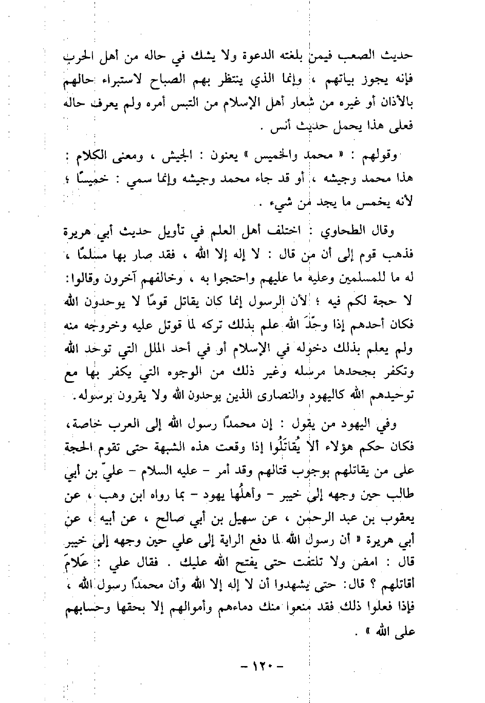 حديث الصعب فيمن بلغته الدعوة ولا يشك فى حاله من أهل الحرب فإنه يجوز بياتهم، وإنما الذى ينتظر بهم الصباح لا ستبراء حالهم بالأذان أو غيره من شعار أهل الإسلام من التبس أمره ولم يعرف حاله فعلى هذا يحمل حديث أنس. وقولهم: (محمد والخميس) يعنون: الجيش، ومعنى الكلام: هذا محمد وجيشه، أو قد جاء محمد وجيشه وإنما سمى: خميسًا؛ لأنه يخمس ما يجد من شيء. وقال الطحاوى: اختلف أهل العلم فى تأويل حديث أبى هريرة فذهب قوم إلى أن من قال: لا إله إلا الله فقد صار بها مسلمًا، له ما للمسلمين وعليه ما عليهم واحتجوا به، وخالفهم آخرون وقالوا: لا حجة لكم فيه؛ لأن الرسول إنما كان يقاتل قومًا لا يوحدون الله فكان أحدهم إذا وحد الله علم بذلك تركه لما قوتل عليه وخروجه منه ولم يعلم بذلك دخوله فى الإسلام أو فى أحد الملل التى توحد الله وتكفر بجحدها مرسله وغير ذلك من الوجوه التى يكفر بها مع توحيدهم الله كاليهود والنصارى الذين يوحدون الله ولا يقرون برسوله. وفى اليهود من يقول: إن محمدًا رسول الله إلى العرب خاصة، فكان حكم هؤلاء ألا يقاتلوا إذا وقعت هذه الشبهة حتى تقوم الحجة على من يقاتلهم بوجوب قتالهم وقد أمر (صلى الله عليه وسلم) على بن أبى طالب حين وجهه إلى خيبر وأهلها يهود بما رواه ابن وهب، عن يعقوب بن عبد الرحمن، عن سهيل بن أبى صالح، عن أبيه، عن أبى هريرة (أن رسول الله لما دفع الراية إلى على حين وجهه إلى خيبر قال: امض ولا تلتفت حتى يفتح الله عليك. فقال على: علام أقاتلهم؟ قال: حتى يشهدوا أن لا إله إلا الله وأن محمدًا رسول الله، فإذا فعلوا ذلك فقد منعوا منك دماءهم وأموالهم إلا بحقها وحسابهم على الله) .