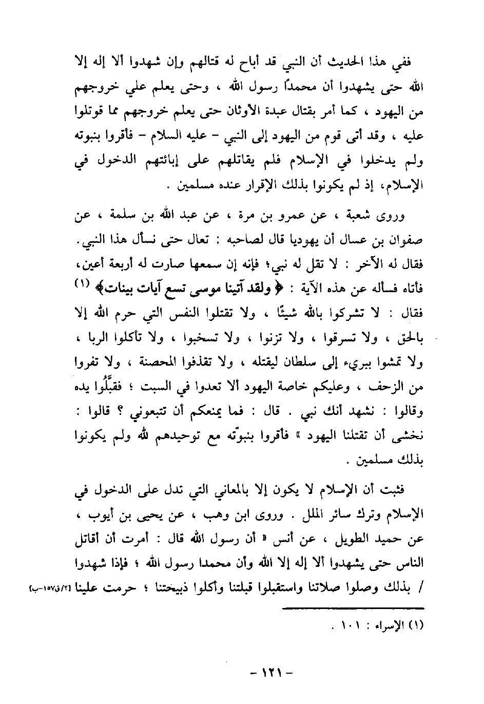 ففى هذا الحديث أن النبى قد أباح له قتالهم وإن شهدوا ألا إله إلا الله حتى يشهدوا أن محمدًا رسول الله، وحتى يعلم على خروجهم من اليهود، كما أمر بقتال عبدة الأوثان حتى يعلم خروجهم مما قوتلوا عليه، وقد أتى قوم من اليهود إلى النبى (صلى الله عليه وسلم) فأقروا بنبوته ولم يدخلوا فى الإسلام فلم يقاتلهم على إبائتهم الدخول فى الإسلام، إذ لم يكونوا بذلك الإقرار عنده مسلمين. وروى شعبة، عن عمرو بن مرة، عن عبد الله بن سلمة، عن صفوان بن عسال أن يهوديًا قال لصاحبه: تعال حتى نسأل هذا النبي. فقال له الآخر: لا تقل له نبى؛ فإنه إن سمعها صارت له أربعة أعين، فأتاه فسأله عن هذه الآية: (ولقد آتينا موسى تسع آيات بينات (فقال: لا تشركوا بالله شيئًا، ولا تقتلوا النفس التى حرم الله إلا بالحق، ولا تسرقوا، ولا تزنوا، ولا تسخبوا، تأكلوا الربا، ولا تمشوا ببريء إلى سلطان ليقتله، ولا تقذفوا المحصنة، ولا تفروا من الزحف، وعليكم خاصة اليهود ألا تعدوا فى السبت؛ فقبلوا يده وقالوا: نشهد أنك نبي. قال: فما يمنعكم أن تتبعونى؟ قالوا: نخشى أن تقتلنا اليهود) فأقروا بنبوته مع توحيدهم لله ولم يكونوا بذلك مسلمين. فثبت أن الإسلام لا يكون إلا بالمعانى التى تدل على الدخول فى الإسلام وترك سائر الملل. وروى ابن وهب، عن يحيى بن أيوب، عن حميد الطويل، عن أنس (أن رسول الله قال: أمرت أن أقاتل الناس حتى يشهدوا ألا إله إلا الله وأن محمدًا رسول الله؛ فإذا شهدوا بذلك وصلوا صلاتنا واستقبلوا قبلتنا وأكلوا ذبيحتنا؛ حرمت علينا