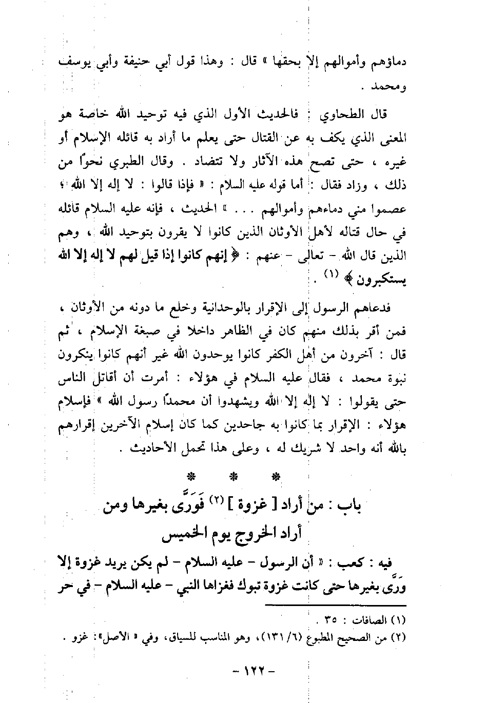 دماؤهم وأموالهم إلا بحقها) قال: وهذا قول أبى حنيفة وأبى يوسف ومحمد. قال الطحاوى: فالحديث الأول الذى فيه توحيد الله خاصة هو المعنى الذى يكف به عن القتال حتى يعلم ما أراد به قائله الإسلام أو غيره، حتى تصح هذه الآثار ولا تتضاد. وقال الطبرى نحوًا من ذلك، وزاد فقال: أما قوله (صلى الله عليه وسلم) : (فإذا قالوا: لا إله إلا الله؛ عصموا منى دماءهم وأموالهم. . .) الحديث، فإنه (صلى الله عليه وسلم) قائله فى حال قتاله لأهل الأوثان الذين كانوا لا يقرون بتوحيد الله، وهم الذين قال الله تعالى عنهم: (إنهم كانوا إذا قيل لهم لا إله إلا الله يستكبرون (. فدعاهم الرسول إلى الإقرار بالوحدانية وخلع ما دونه من الأوثان، فمن أقر بذلك منهم كان فى الظاهر داخلا فى صبغة الإسلام، ثم قال: آخرون من أهل الكفر كانوا يوحدون الله غير أنهم كانوا ينكرون نبوة محمد، فقال (صلى الله عليه وسلم) فى هؤلاء: أمرت أن أقاتل الناس حتى يقولوا: لا إله إلا الله ويشهدوا أن محمدًا رسول الله) فإسلام هؤلاء: الإقرار بما كانوا به جاحدين كما كان إسلام الآخرين إقرارهم بالله أنه واحد لا شريك له، وعلى هذا تحمل الأحاديث.