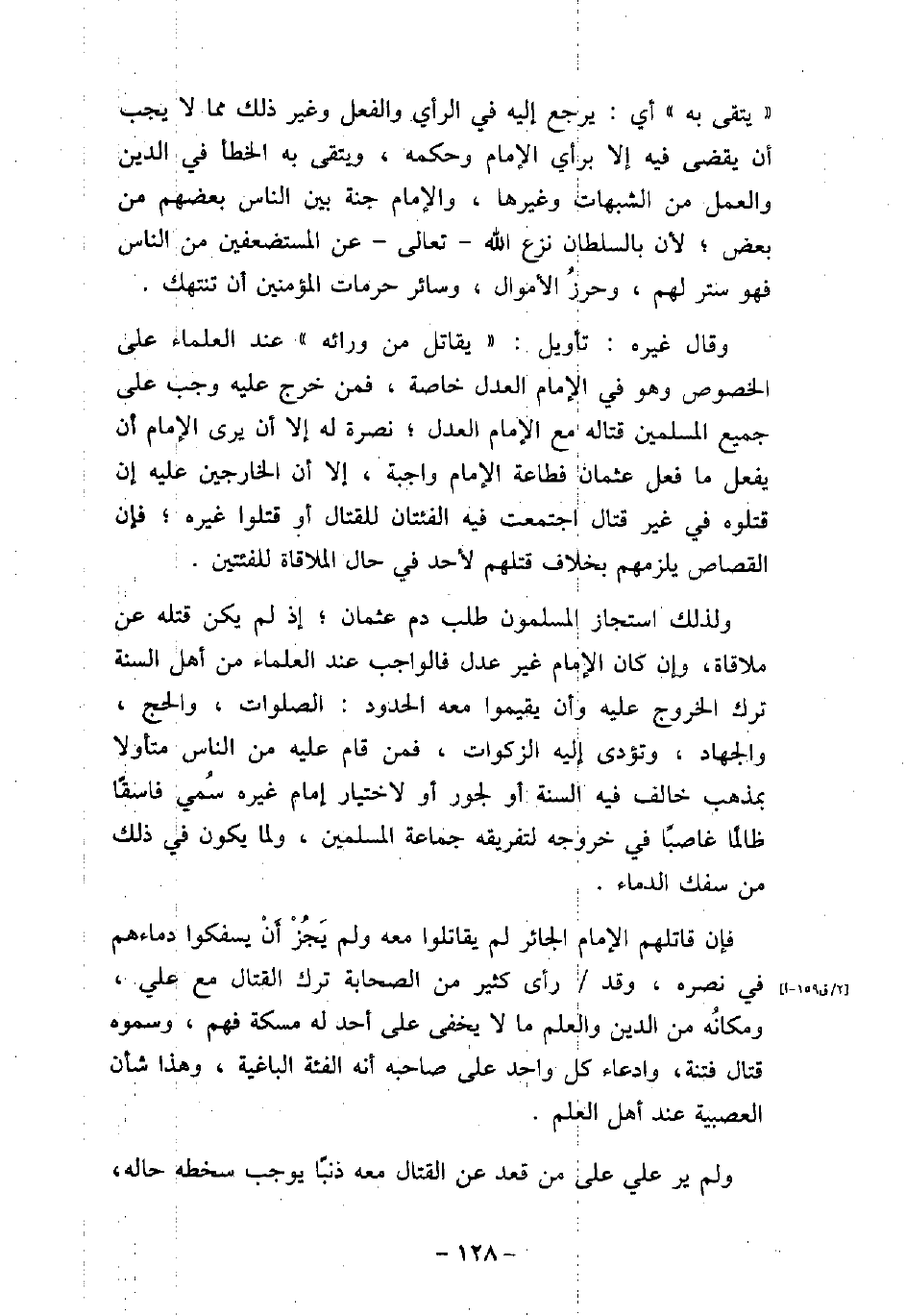 (يتقى به) أى: يرجع إليه فى الرأى والفعل وغير ذلك مما لا يجب أن يقضى فيه إلا برأى الإمام وحكمه، ويتقى به الخطأ فى الدين والعمل من الشبهات وغيرها، والإمام جنة بين الناس بعضهم من بعض؛ لأن بالسطان نزع الله تعالى عن المستضعفين من الناس فهو ستر لهم، وحرز الأموال، وسائر حرمات المؤمنين أن تنتهك. وقال غيره: تأويل: (يقاتل من ورائه) عند العلماء على الخصوص وهو فى الإمام العدل خاصة، فمن خرج عليه وجب على جميع المسلمين قتاله مع الإمام العدل؛ نصرة له إلا أن يرى الإمام أن يفعل ما فعل عثمان فطاعة الإمام واجبة، إلا أن الخارجين عليه إن قتلوه فى غير قتال اجتمعت فيه الفئتان للقتال أو قتلوا غيره؛ فإن القصاص يلزمهم بخلاف قتلهم لأحد فى حال الملاقاة للفئتين. ولذلك استجاز المسلمون طلب دم عثمان؛ إذ لم يكن قتله عن ملاقاة، وإن كان الإمام غير عدل فالواجب عند العلماء من أهل السنة ترك الخرج عليه وأن يقيموا معه الحدود: الصلوات، والحج، والجهاد، وتؤدى إليه الزكوات، فمن قام عليه من الناس متأولا بمذهب خالف فيه السنة أو لجور أو لاختيار إمام غيره سمى فاسقًا ظالمًا غاصبًا فى خروجه لتفريقه جماعة المسلمين، ولما يكون فى ذلك من سفك الدماء. فإن قاتلهم الإمام الجائر لم يقاتلوا معه ولم يجز أن يسفكوا دماءهم فى نصره، وقد رأى كثير من الصحابة ترك القتال مع على، ومكانه من الدين والعلم ما لا يخفى على أحد له مسكة فهم، وسموه قتال فتنة، وادعاء كل واحد على صاحبه أنه الفئة الباغية، وهذا شأن العصبية عند أهل العلم. ولم ير علىّ على من قعد عن القتال معه ذنبًا يوجب سخطه حاله،