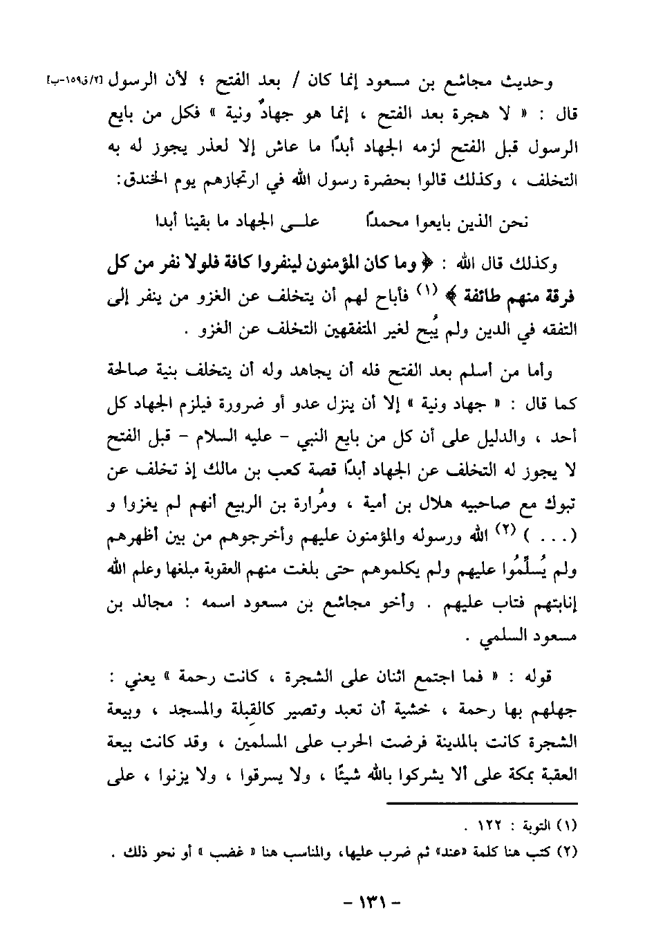 وحديث مجاشع بن مسعود إنما كان بعد الفتح؛ لأن الرسول قال: (لا هجرة بعد الفتح، إنما هو جهاد ونية) فكل من بايع الرسول قبل الفتح لزمه الجهاد أبدًا ما عاش إلا لعذر يجوز له به التخلف، وكذلك قالوا بحضرة رسول الله فى ارتجازهم يوم الخندق: نحن الذين بايعوا محمدًا على الجهاد ما بقينا أبدًا وكذلك قال الله: (وما كان المؤمنون لينفروا كافة فلولا نفر من كل فرقة منهم طائفة (فأباح لهم أن يتخلف عن الغزو من ينفر إلى التفقه فى الدين ولم يبح لغير المتفقهين التخلف عن الغزو. وأما من أسلم بعد الفتح فله أن يجاهد وله أن يتخلف بنية صالحة كما قال: (جهاد ونية) إلا أن ينزل عدو أو ضرورة فيلزم الجهاد كل أحد، والدليل على أن كل من بايع النبى (صلى الله عليه وسلم) قبل الفتح لا يجوز له التخلف عن الجهاد أبدًا قصة كعب بن مالك إذ تخلف عن تبوك مع صاحبيه هلال بن أمية، ومرارة بن الربيع أنهم لم يغزوا و [. . . . .] الله ورسوله والمؤمنون عليهم وأخرجوهم من بين أظهرهم ولم يسلموا عليهم ولم يكلموهم حتى بلغت منهم العقوبة مبلغها وعلم الله إنابتهم فتاب عليهم. وأخو مجاشع بن مسعود أسمه: مجالد ابن مسعود السلمي. قوله: (فما اجتمع اثنان على الشجرة، كانت رحمة) يعنى: جهلهم بها رحمة، خشية أن تعبد وتصير كالقبلة والمسجد، وبيعة الشجرة كانت بالمدينة فرضت الحرب على المسلمين، وقد كانت بيعة العقبة بمكة على ألا يشركوا بالله شيئًا، ولا يسرقوا، ولا يزنوا، على