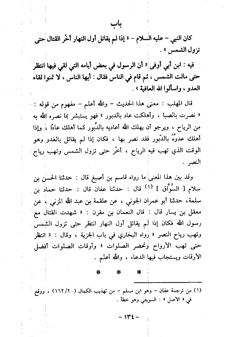 كَانَ النَّبِىُّ، (صلى الله عليه وسلم) : (إِذَا لَمْ يُقَاتِلْ أَوَّلَ النَّهَارِ أَخَّرَ الْقِتَالَ حَتَّى تَزُولَ الشَّمْسُ) 1798 / فيه: ابْن أَبِى أَوْفَى، إِنَّ الرسول (صلى الله عليه وسلم) فِى بَعْضِ أَيَّامِهِ الَّتِى لَقِىَ فِيهَا، انْتَظَرَ حَتَّى مَالَتِ الشَّمْسُ، ثُمَّ قَامَ فِى النَّاسِ، فَقَالَ: (أَيُّهَا النَّاسُ، لا تَتَمَنَّوْا لِقَاءَ الْعَدُوِّ، وَسَلُوا اللَّهَ الْعَافِيَةَ) . قال المهلب: معنى هذا الحديث والله أعلم مفهوم من قوله: (نصرت بالصبا، وأهلكت عاد بالدبور) فهو يستبشر بما نصره الله به من الرياح، ويرجو أن يهلك الله أعاديه بالدبور كما أهلك عادًا، وإذا أهلك عدوه بالدبور فقد نصر بها، فكان إذا لم يقاتل بالغدو وهو الوقت الذى تهب فيه الرياح، أخر حتى تزول الشمس وتهب رياح النصر. وقد بين هذا المعنى ما رواه قاسم بن أصبغ قال: حدثنا الحسن بن سلام السواق، قال: حدثنا عفان قال: حدثنا حماد بن سلمة، حدثنا أبو عمران الجونى، عن علقمة بن عبد الله المزنى، عن معقل بن يسار قال: قال النعمان بن مقرن: (شهدت القتال مع رسول الله فكان إذا لم يقاتل أول النهار انتظر حتى تزول الشمس وتهب رياح النصر) رواه البخارى فى باب الجزية، وقال: (انتظر حتى تهب الأرواح وتحضر الصلوات) وأوقات الصلوات أفضل الأوقات ويستجاب فيها الدعاء، والله أعلم.