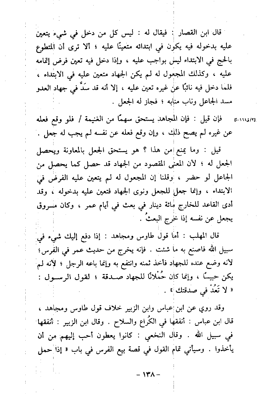 قال ابن القصار: فيقال له: ليس كل من دخل فى شيء يتعين عليه بدخوله فيه يكون فى ابتدائه متعينًا عليه؛ ألا ترى أن المتطوع بالحج فى الابتداء ليس بواجب عليه، وإذا دخل فيه تعين فرض إتمامه عليه، وكذلك المجعول له لم يكن الجهاد متعين عليه فى الابتداء، فلما دخل فيه نائبًا عن غيره تعين عليه، إلا أنه قد سد فى جهاد العدو مسد الجاعل وناب منابه؛ فجاز له الجعل. فإن قيل: فإن المجاهد يستحق سهمًا من الغنيمة فلو وقع فعله عن غيره لم يصح ذلك، وإن وقع فعله عن نفسه لم يجب له جعل. قيل: وما يمنع من هذا؟ هو يستحق الجعل بالمعاونة ويحصل الجعل له؛ لأن المعنى المقصود من الجهاد قد حصل كما يحصل من الجاعل لو حضر، وقلنا إن المجعول له لم يتعين عليه الفرض فى الابتداء، وإنما جعل للجعل ونوى الجهاد فتعين عليه بدخوله، وقد أدى القاعد للخارج مائة دينار فى بعث فى أيام عمر، وكان مسروق يجعل عن نفسه إذا خرج البعث. قال المهلب: أما قول طاوس ومجاهد: إذا دفع إليك شيء فى سبيل الله فاصنع به ما شئت. فإنه يخرج من حديث عمر فى الفرس؛ لأنه وضع عنده للجهاد فأخذ ثمنه وانتفع به وإنما باعه الرجل؛ لأنه لم يكن حبيسًا، وإنما كان حملانًا للجهاد صدقة؛ لقول الرسول: (لا تعد فى صدقتك) . وقد روى عن ابن عباس وابن الزبير خلاف قول طاوس ومجاهد، قال ابن عباس: أنفقها فى الكراع والسلاح. وقال ابن الزبير: أنفقها فى سبيل الله. وقال النخعى: كانوا يعطون أحب إليهم من أن يأخذوا. وسيأتى تمام القول فى قصة بيع الفرس فى باب (إذا حمل