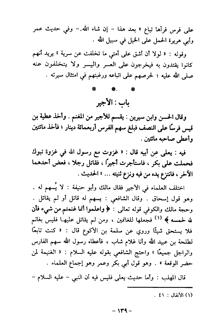 وَقَالَ الْحَسَنُ وَابْنُ سِيرِينَ: يُقْسَمُ لِلأجِيرِ مِنَ الْمَغْنَمِ. وَأَخَذَ عَطِيَّةُ بْنُ قَيْسٍ فَرَسًا عَلَى النِّصْفِ، فَبَلَغَ سَهْمُ الْفَرَسِ أَرْبَعَ مِائَةِ دِينَارٍ، فَأَخَذَ مِائَتَيْنِ، وَأَعْطَى صَاحِبَهُ مِائَتَيْنِ. 1803 / فيه: يَعْلَى، عَنْ أَبِيهِ، قَالَ: (غَزَوْتُ مَعَ رَسُولِ اللَّهِ (صلى الله عليه وسلم) غَزْوَةَ تَبُوكَ، فَحَمَلْتُ عَلَى بَكْرٍ، فَاسْتَأْجَرْتُ أَجِيرًا، فَقَاتَلَ رَجُلا، فَعَضَّ أَحَدُهُمَا الآخَرَ، فَانْتَزَعَ يَدَهُ مِنْ فِيهِ، وَنَزَعَ ثَنِيَّتَهُ. . . . الحديث. اختلف العلماء فى الأجير فقال مالك وأبو حنيفة: لا يسهم له. وهو قول إسحاق. وقال الشافعى: يسهم له قاتل أو لم يقاتل. وحجة مالك والكوفى قوله تعالى: (واعلموا أنما غنمتم من شىء فإن لله خمسه (فجعلها للغانمين، ومن لم يقاتل عليها فليس بغانم فلا يستحق شيئًا وروى عن سلمة بن الأكوع قال: (كنت تابعًا لطلحة بن عبيد الله وأنا غلام شاب، فأعطاه رسول الله سهم الفارس والراجل جميعًا) واحتج الشافعى بقوله (صلى الله عليه وسلم) : (الغنيمة لمن حضر الوقعة) . وهو قول أبى بكر وعمر وهو إجماع العلماء. قال المهلب: وأما حديث يعلى فليس فيه أن النبى عليه السلام