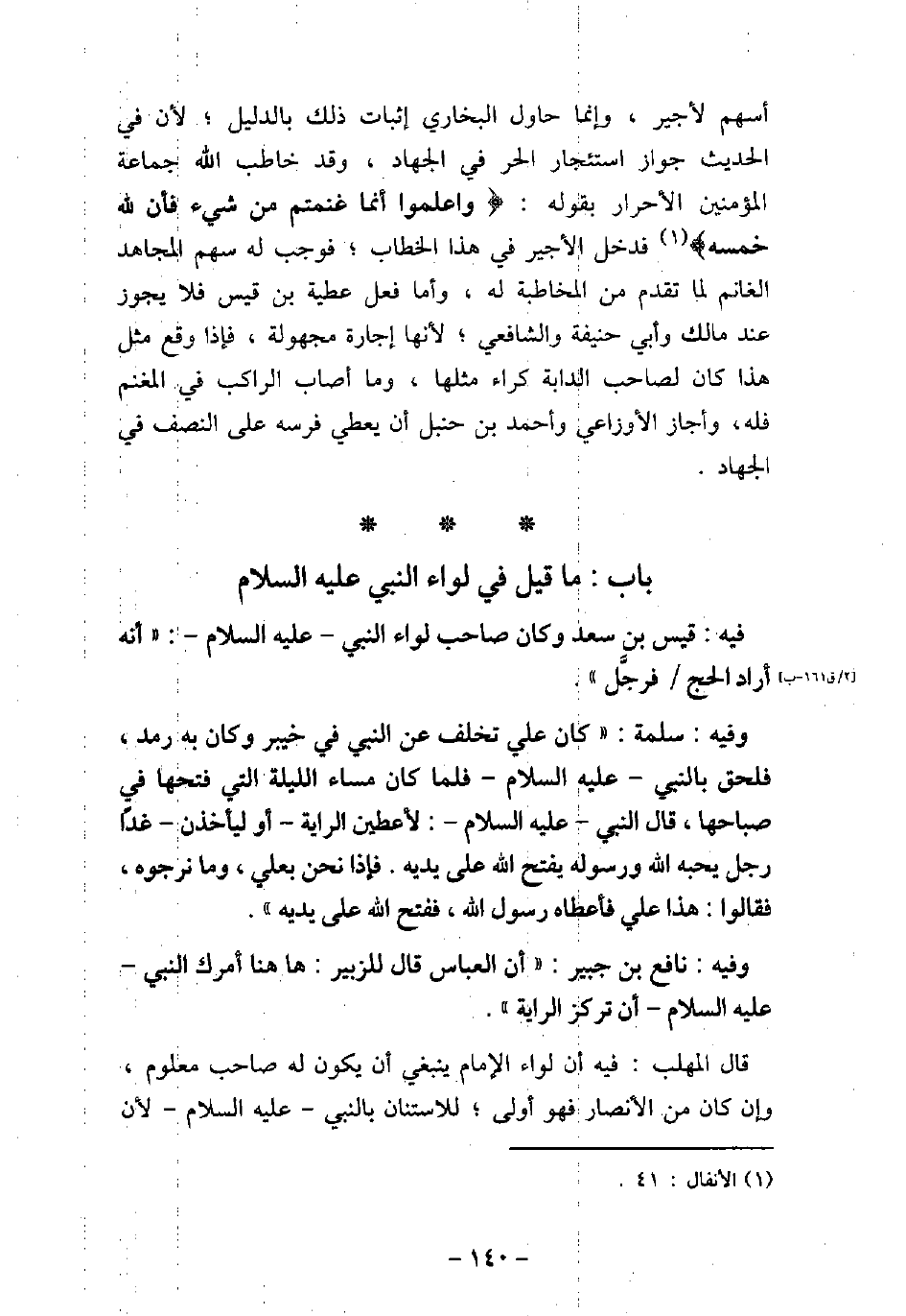 804 / فيه: قَيْسَ بْنَ سَعْدٍ، وَكَانَ صَاحِبَ لِوَاءِ النَّبِىّ، (صلى الله عليه وسلم) ، أَنَّهُ أَرَادَ الْحَجَّ فَرَجَّلَ. 1805 / وفيه: سَلَمَةَ، كَانَ عَلِىٌّ تَخَلَّفَ عَنِ النَّبِىِّ (صلى الله عليه وسلم) فِى خَيْبَرَ، وَكَانَ بِهِ رَمَدٌ، فَلَحِقَ بِالنَّبِىِّ، (صلى الله عليه وسلم) ، فَلَمَّا كَانَ مَسَاءُ اللَّيْلَةِ الَّتِى فَتَحَهَا فِى صَبَاحِهَا، قَالَ النَّبِىّ، (صلى الله عليه وسلم) : (لأعْطِيَنَّ الرَّايَةَ - أَوْ لَيَأْخُذَنَّ - غَدًا رَجُلٌ يُحِبُّهُ اللَّهُ وَرَسُولُهُ يَفْتَحُ اللَّهُ عَلَىَ يَدَيْهِ) ، فَإِذَا نَحْنُ بِعَلِىٍّ، وَمَا نَرْجُوهُ، فَقَالُوا: هَذَا عَلِىٌّ، فَأَعْطَاهُ رَسُولُ اللَّهِ (صلى الله عليه وسلم) ، فَفَتَحَ اللَّهُ عَلَىَ يَدَيْهِ. 1806 / وفيه: نَافِعِ بْنِ جُبَيْرٍ، أن الْعَبَّاسَ، قَالَ لِلْزُّبَيْرِ: هَاهُنَا أَمَرَكَ النَّبِىُّ، (صلى الله عليه وسلم) ، أَنْ تَرْكُزَ الرَّايَةَ. قال المهلب: فيه أن لواء الإمام ينبغى أن يكون له صاحب معلوم، وإن كان من الأنصار فهو أولى؛ للاستنان بالنبى - (صلى الله عليه وسلم) - لأن