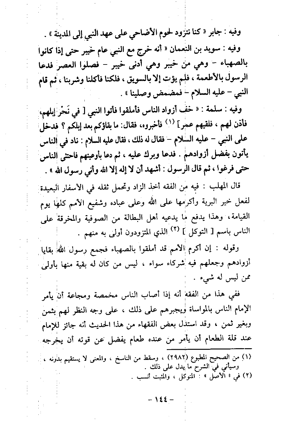 10 / وفيه: جَابِر، كُنَّا نَتَزَوَّدُ لُحُومَ الأضَاحِىِّ عَلَى عَهْدِ النَّبِىِّ (صلى الله عليه وسلم) إِلَى الْمَدِينَةِ. 1811 / وفيه: سُوَيْدَ بْنَ النُّعْمَانِ، أَنَّهُ خَرَجَ مَعَ النَّبِىِّ (صلى الله عليه وسلم) عَامَ خَيْبَرَ حَتَّى إِذَا كَانُوا بِالصَّهْبَاءِ، وَهِىَ مِنْ خَيْبَرَ، وَهِىَ أَدْنَى خَيْبَرَ، فَصَلَّوُا الْعَصْرَ، فَدَعَا الرسول (صلى الله عليه وسلم) بِالأطْعِمَةِ، فَلَمْ يُؤْتَ إِلا بِسَوِيقٍ، فَلُكْنَا، فَأَكَلْنَا وَشَرِبْنَا، ثُمَّ قَامَ النَّبِىُّ، (صلى الله عليه وسلم) ، فَمَضْمَضَ، [وَمَضْمَضْنَا] ، وَصَلَّيْنَا. 1812 / وفيه: سَلَمَةَ، خَف أَزْوَادُ النَّاسِ وَأَمْلَقُوا، فَأَتَوُا النَّبِىَّ (صلى الله عليه وسلم) [فِى نَحْرِ إِبِلِهِمْ، فَأَذِنَ لَهُمْ، فَلَقِيَهُمْ عُمَرُ] فَأَخْبَرُوهُ، فَقَالَ: مَا بَقَاؤُكُمْ بَعْدَ إِبِلِكُمْ؟ فَدَخَلَ عُمَرُ عَلَى النَّبِىِّ، (صلى الله عليه وسلم) ، فَقَالَ (صلى الله عليه وسلم) : (نَادِ فِى النَّاسِ يَأْتُونَ بِفَضْلِ أَزْوَادِهِمْ، فَدَعَا وَبَرَّكَ عَلَيْهِ، ثُمَّ دَعَاهُمْ بِأَوْعِيَتِهِمْ) ، فَاحْتَثَى النَّاسُ حَتَّى فَرَغُوا، ثُمَّ قَالَ رَسُولُ اللَّهِ (صلى الله عليه وسلم) : (أَشْهَدُ أَنْ لا إِلَهَ إِلا اللَّهُ وَأَنِّى رَسُولُ اللَّهِ) . قال المهلب: فيه من الفقه أخذ الزاد وتحمل ثقله فى الأسفار البعيدة لفعل خير البرية وأكرمها على الله وعلى عباده وشفيع الأمم كلها يوم القيامة، وهذا يدفع ما يدعيه أهل البطالة من الصوفية والمخرقة على الناس باسم التوكل الذى المتزودون أولى به منهم. وقوله: إن أكرم الأمم قد أملقوا بالصهباء فجمع رسول الله بقايا أزوادهم وجعلهم فيه شركاء سواء، ليس من كان له بقية منها بأولى ممن ليس له شيء. ففى هذا من الفقه أنه إذا أصاب الناس مخمصة ومجاعة أن يأمر الإمام الناس بالمواساة ويجبرهم على ذلك، على وجه النظر لهم بثمن وبغير ثمن، وقد استدل بعض الفقهاء من هذا الحديث أنه جائز للإمام عند قلة الطعام أن يأمر من عنده طعام يفضل عن قوته أن يخرجه