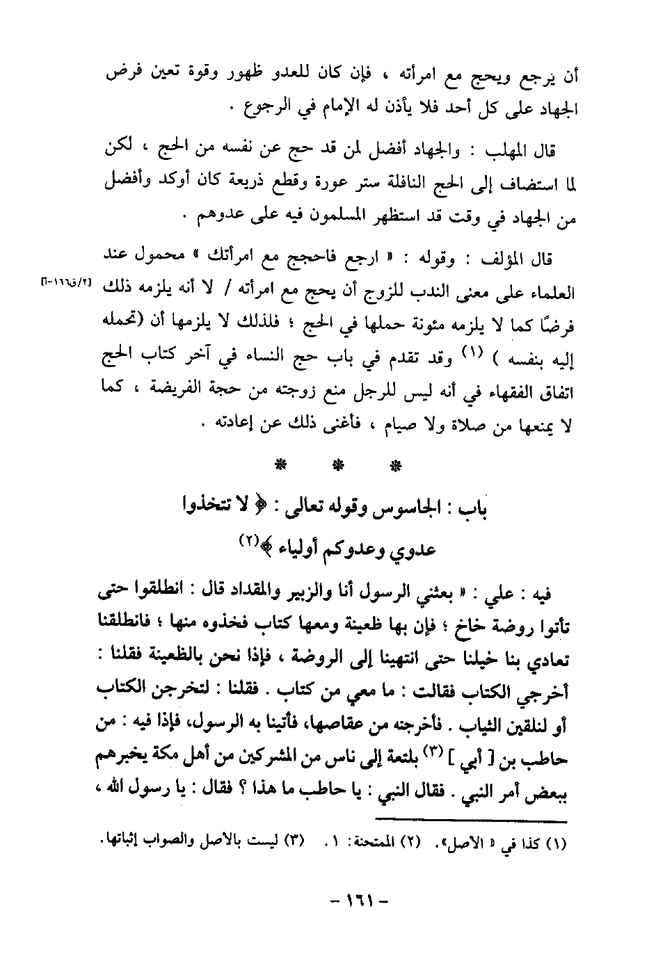 834 / فيه: عَلِىّ، بَعَثَنِى الرسول (صلى الله عليه وسلم) أَنَا وَالزُّبَيْرَ وَالْمِقْدَادَ، قَالَ: (انْطَلِقُوا حَتَّى تَأْتُوا رَوْضَةَ خَاخٍ، فَإِنَّ بِهَا ظَعِينَةً، وَمَعَهَا كِتَابٌ فَخُذُوهُ مِنْهَا) ، فَانْطَلَقْنَا تَعَادَى بِنَا خَيْلُنَا حَتَّى انْتَهَيْنَا إِلَى الرَّوْضَةِ، فَإِذَا نَحْنُ بِالظَّعِينَةِ، فَقُلْنَا: أَخْرِجِى الْكِتَابَ، فَقَالَتْ: مَا مَعِى مِنْ كِتَابٍ، فَقُلْنَا: لَتُخْرِجِنَّ الْكِتَابَ أَوْ لَنُلْقِيَنَّ الثِّيَابَ، فَأَخْرَجَتْهُ مِنْ عِقَاصِهَا، فَأَتَيْنَا بِها الرسول (صلى الله عليه وسلم) فَإِذَا فِيهِ مِنْ حَاطِبِ بْنِ أَبِى بَلْتَعَةَ إِلَى نَاسٍ مِنَ الْمُشْرِكِينَ مِنْ أَهْلِ مَكَّةَ، يُخْبِرُهُمْ بِبَعْضِ أَمْرِ النَّبِىّ (صلى الله عليه وسلم) ، فَقَالَ النَّبِىّ (صلى الله عليه وسلم) : (يَا حَاطِبُ، مَا هَذَا) ؟ فَقَالَ: يَا رَسُولَ اللَّهِ،
