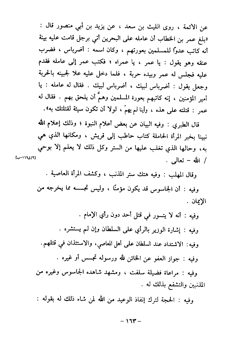 عن الأئمة، روى الليث بن سعد، عن يزيد بن أبى منصور قال: (بلغ عمر بن الخطاب أن عامله على البحرين أتى برجل قامت عليه بينة أنه كاتب عدوًا للمسلمين بعورتهم، وكان اسمه: أضرباس، فضرب عنقه وهو يقول: يا عمر، يا عمراه، فكتب عمر إلى عامله فقدم عليه فجلس له عمر وبيده حربة، فلما دخل عليه علا لجبينه بالحربة وجعل يقول: أضرباس لبيك، أضرباس لبيك. . فقال له عامله: يا أمير المؤمنين، إنه كاتبهم بعورة المسلمين وهم أن يلحق بهم. فقال له عمر: قتلته على هذه، وأينا لم يهم، لولا أن تكون سيئة لقتلتك به) . قال الطبرى: وفيه البيان عن بعض أعلام النبوة؛ وذلك إعلام الله نبينا بخبر المرأة الحاملة كتاب حاطب إلى قريش، ومكانها الذى هى به، وحالها الذى تغلب عليها من الستر وكل ذلك لا يعلم إلا بوحى الله تعالى. وقال المهلب: وفيه هتك ستر المذنب، وكشف المرأة العاصية. وفيه: أن الجاسوس قد يكون مؤمنًا، وليس تجسسه مما يخرجه من الإيمان. وفيه: أنه لا يتسور فى قتل أحد دون رأى الإمام. وفيه: إشارة الوزير بالرأى على السلطان وإن لم يستشره. وفيه: الاشتداد عند السلطان على أهل المعاصى، والاستئذان فى قتلهم. وفيه: جواز العفو عن الخائن لله ورسوله تجسس أو غيره. وفيه: مراعاة فضيلة سلفت، ومشهد شاهده الجاسوس وغيره من المذنبين والتشفع بذلك له. وفيه: الحجة لترك إنفاذ الوعيد من الله لمن شاء ذلك له بقوله: