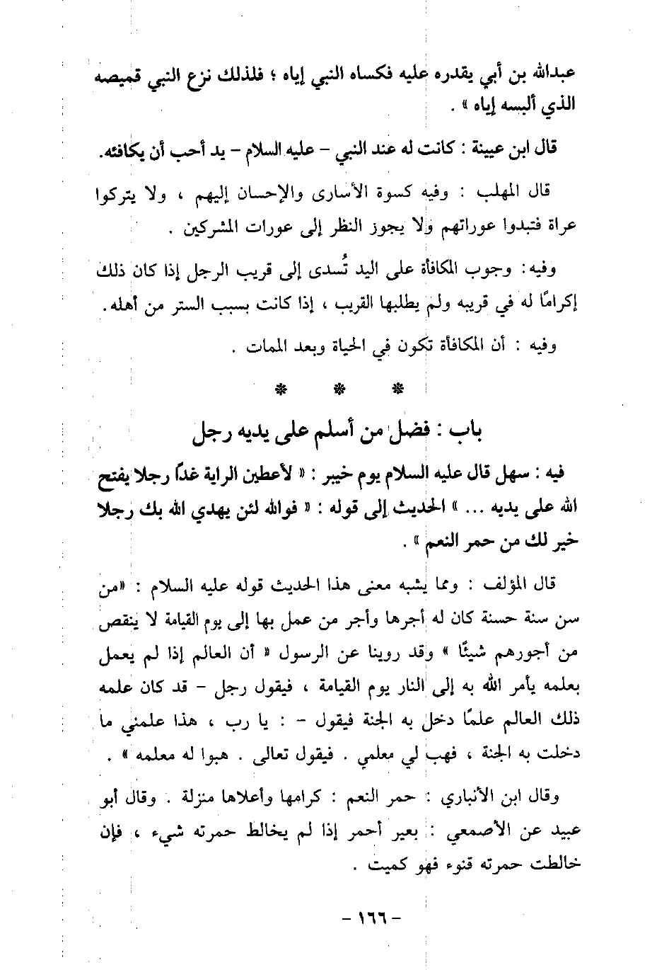 836 / فيه: سَهْل، قَالَ (صلى الله عليه وسلم) يَوْمَ خَيْبَرَ: (لأعْطِيَنَّ الرَّايَةَ غَدًا رَجُلا، يُفْتَحُ عَلَى يَدَيْهِ. . . . .) الحديث إلى قوله: (فَوَاللَّهِ لأنْ يَهْدِىَ اللَّهُ بِكَ رَجُلا، خَيْرٌ لَكَ مِنْ أَنْ يَكُونَ لَكَ حُمْرُ النَّعَمِ) . قال المؤلف: ومما يشبه معنى هذا الحديث قوله (صلى الله عليه وسلم) : (من سن سنة حسنة كان له أجرها وأجر من عمل بها إلى يوم القيامة لا ينقص من أجورهم شيئًا) وقد روينا عن الرسول: (أن العالم إذا لم يعمل بعلمه يأمر الله به إلى النار يوم القيامة، فيقول رجل قد كان علمه ذلك العالم علمًا دخل به الجنة فيقول -: يا رب، هذا علمنى ما دخلت به الجنة، فهب لى معلمي. فيقول تعالى. هبوا له معلمه) . وقال ابن الأنبارى: حمر النعم: كرامها وأعلاها منزلة. وقال أبو عبيد عن الأصمعى: بعير أحمر إذا لم يخالط حمرته شيء، فإن خالطت حمرته قنوء فهو كميت.