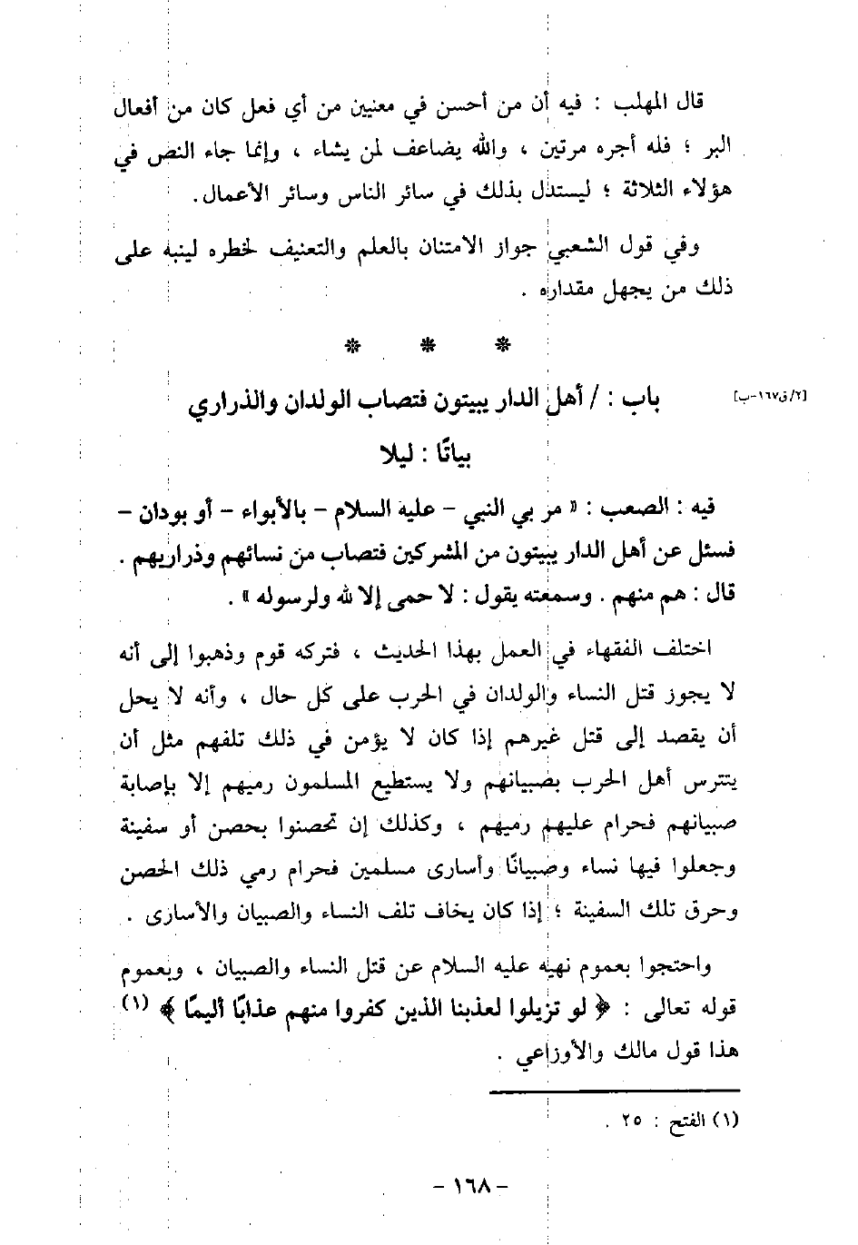 839 / فيه: الصَّعْبِ، مَرَّ بِىَ النَّبِىُّ، (صلى الله عليه وسلم) ، بِالأبْوَاءِ - أَوْ بِوَدَّانَ - فَسُئِلَ عَنْ أَهْلِ الدَّارِ يُبَيَّتُونَ مِنَ الْمُشْرِكِينَ، فَيُصَابُ مِنْ نِسَائِهِمْ وَذَرَارِيِّهِمْ، قَالَ: (هُمْ مِنْهُمْ) ، وَسَمِعْتُهُ، يَقُولُ: (لا حِمَى إِلا لِلَّهِ وَلِرَسُولِهِ) . اختلف الفقهاء فى العمل بهذا الحديث، فتركه قوم وذهبوا إلى أنه لا يجوز قتل النساء والولدان فى الحرب على كل حال، وأنه لا يحل أن يقصد إلى قتل غيرهم إذا كان لا يؤمن فى ذلك تلفهم مثل أن يتترس أهل الحرب بصبيانهم ولا يستطيع المسلمون رميهم، إلا بإصابة صبيانهم فحرام عليهم رميهم، وكذلك إن تحصنوا بحصن أو سفينة وجعلوا فيها نساء وصبيانًا وأسارى مسلمين فحرام رمى ذلك الحصن وحرق تلك السفينة؛ إذا كان يخاف تلف النساء والصبيان والأسارى. واحتجوا بعموم نهيه (صلى الله عليه وسلم) عن قتل النساء والصبيان، وبعموم قوله تعالى: (لو تزيلوا لعذبنا الذين كفروا منهم عذابًا أليمًا (هذا قول مالك والأوزاعي.
