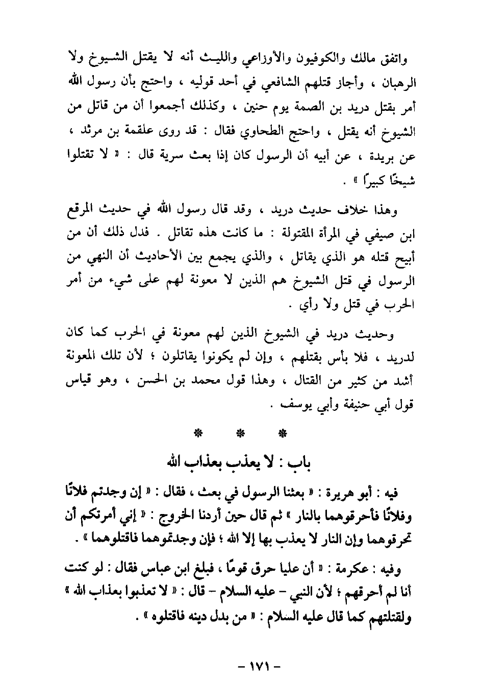 841 / فيه: أَبُو هُرَيْرَةَ، بَعَثَنَا الرسول (صلى الله عليه وسلم) فِى بَعْثٍ، فَقَالَ: (إِنْ وَجَدْتُمْ فُلانًا وَفُلانًا فَأَحْرِقُوهُمَا بِالنَّارِ) ، ثُمَّ قَالَ حِينَ أَرَدْنَا الْخُرُوجَ: (إِنِّى أَمَرْتُكُمْ أَنْ تُحْرِقُوهما، وَإِنَّ النَّارَ لا يُعَذِّبُ بِهَا إِلا اللَّهُ، فَإِنْ وَجَدْتُمُوهُمَا فَاقْتُلُوهُمَا) . 1842 / وفيه: عِكْرِمَةَ، أَنَّ عَلِيًّا حَرَّقَ قَوْمًا، فَبَلَغَ ابْنَ عَبَّاسٍ، فَقَالَ: لَوْ كُنْتُ أَنَا لَمْ أُحَرِّقْهُمْ، لأنَّ النَّبِىَّ؛ (صلى الله عليه وسلم) ، قَالَ: (لا تُعَذِّبُوا بِعَذَابِ اللَّهِ) ، وَلَقَتَلْتُهُمْ كَمَا قَالَ (صلى الله عليه وسلم) : (مَنْ بَدَّلَ دِينَهُ فَاقْتُلُوهُ) .