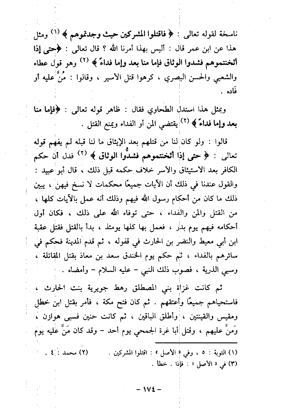ناسخة لقوله تعالى: (فاقتلوا المشرككين حيث وجدتموهم (ومثل هذا عن ابن عمر قال: أليس بهذا أمرنا الله؟ قال تعالى: (حتى إذا أثخنتموهم فشدوا الوثاق فإما منا بعد وإما فداء (وهو قول عطاء والشعبى والحسن البصرى، كرهوا قتل الأسير، وقالوا: مُنَّ عليه أو فاده. وبمثل هذا استدل الطحاوى فقال: ظاهر قوله تعالى: (فإما منا بعد وإما فداء (يقتضى المن أو الفداء ويمنع القتل. قالوا: ولو كان لنا من قتلهم بعد الإيثاق ما لنا قبله لم يفهم قوله تعالى: (حتى إذا أُثخنتموهم فشدوا الوثاق (فدل أن حكم الكافر بعد الاستيثاق والأسر خلاف حكمه قبل ذلك، قال أبو عبيد: والقول عندنا فى ذلك أن الآيات جميعًا محكمات لا نسخ فيهن، يبين ذلك ما كان من أحكام رسول الله فيهم وذلك أنه عمل بالآيات كلها، من القتل والمن والفداء، حتى توفاه الله على ذلك، فكان أول أحكامه فيهم يوم بدر، فعمل بها كلها يومئذ، بدأ بالقتل فقتل عقبة ابن أبى معيط والنضر بن الحارث فى قفوله، ثم قدم المدينة فحكم فى سائرهم بالفداء، ثم حكم يوم الخندق سعد بن معاذ بقتل المقاتلة، وسبى الذرية، فصوب ذلك النبى (صلى الله عليه وسلم) وأمضاه. ثم كانت غزاة بنى المصطلق رهط جويرية بنت الحارث، فاستحياهم جميعًا وأعتقهم. ثم كان فتح مكة، فأمر بقتل ابن خطل ومقيس والقينتين، وأطلق الباقين، ثم كانت حنين فسبى هوازن، ومَنَّ عليهم، وقتل أبا غرة الجمحى يوم أُحد وقد كان مَنَّ عليه يوم