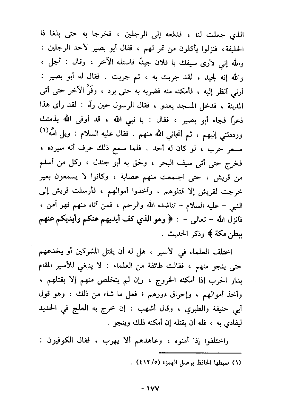 الذى جعلت لنا، فدفعه إلى الرجلين، فخرجا به حتى بلغا ذا الحليفة، فنزلوا يأكلون من تمر لهم، فقال أبو بصير لأحد الرجلين: والله إنى لأرى سيفك يا فلان جيدًا فاستله الآخر، وقال: أجل، والله إنه لجيد، لقد جربت به، ثم جربت. فقال له أبو بصير: أرانى أنظر إليه، فأمكنه منه فضربه به حتى برد، وفر الآخر حتى أتى المدينة، فدخل المسجد يعدو، فقال الرسول حين رآه: لقد رأى هذا ذعرًا فجاء أبو بصير، فقال: يا نبى الله، قد أوفى الله بذمتك ورددتنى إليهم، ثم أنجانى الله منهم. فقال (صلى الله عليه وسلم) : ويل أمه مسعر حرب، لو كان له أحد. فلما سمع ذلك عرف أنه سيرده، فخرج حتى أتى سيف البحر، ولحق به أبو جندل، وكل من أسلم من قريش، حتى اجتمعت منهم عصابة، وكانوا لا يسمعون بعير خرجت لقريش إلا قتلوهم، وأخذوا أموالهم، فأرسلت قريش إلى النبى (صلى الله عليه وسلم) تناشده الله والرحم، فمن أتاه منهم فهو آمن، فأنزل الله تعالى: (وهو الذى كف أيديهم عنكم وأيديكم عنهم ببطن مكة (وذكر الحديث. اختلف العلماء فى الأسير، هل له أن يقتل المشركين أو يخدعهم حتى ينجو منهم، فقالت طائفة من العلماء: لا ينبغى للأسير المقام بدار الحرب إذا أمكنه الخروج، وإن لم يتخلص منهم إلا بقتلهم، وأخذ أموالهم، وإحراق دورهم؛ فعل ما شاء من ذلك، وهو قول أبى حنيفة والطبرى، وقال أشهب: إن خرج به العلج فى الحديد ليفادى به، فله أن يقتله إن أمكنه ذلك وينجو. واختلفوا إذا أمنوه، وعاهدهم ألا يهرب، فقال الكوفيون: