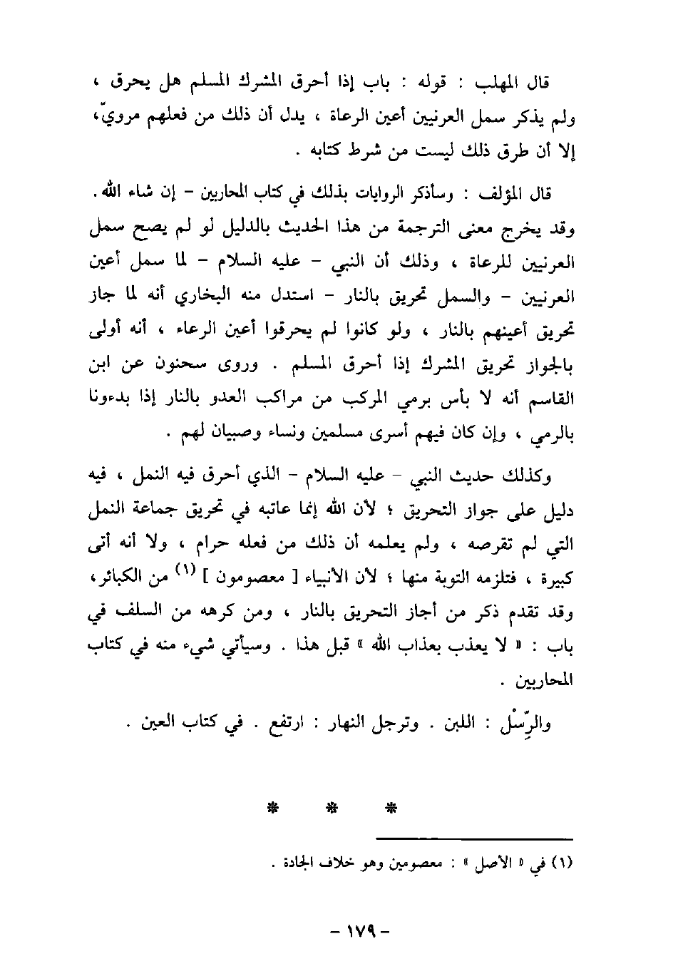 قال المهلب: قوله: باب إذا أحرق المشرك المسلم هل يحرق، ولم يذكر سمل العرنيين أعين الرعاة، يدل أن ذلك من فعلهم مروى، إلا أن طرق ذلك ليست من شرط كتابه. قال المؤلف: وسأذكر الروايات بذلك فى كتاب المحاربين إن شاء الله وقد يخرج معنى الترجمة من هذا الحديث بالدليل لو لم يصح سمل العرنيين والسمل العرنيين للرعاة، وذلك أن النبى - (صلى الله عليه وسلم) - تحريق بالنار، استدل منه البخارى أنه لما جاز تحريق أعينهم بالنار ولو كانوا لم يحرقوا أعين الرعاء، أنه أولى بالجواز تحريق المشرك إذا أحرق المسلم. وروى سحنون عن ابن القاسم أنه لا بأس برمى المركب من مراكب العدو بالنار إذا بدءونا بالرمى، وإن كان فيهم أسرى مسلمين ونساء وصبيان لهم. وكذلك حديث النبى (صلى الله عليه وسلم) الذى أحرق فيه النمل، فيه دليل على جواز التحريق؛ لأن الله إنما عاتبه فى تحريق جماعة النمل التى لم تقرصه، ولم يعلمه أن ذلك من فعله حرام، ولا أنه أتى كبيرة، فتلزمه التوبة منها؛ لأن الأنبياء معصومون من الكبائر، وقد تقدم ذكر من أجاز التحريق بالنار، ومن كرهه من السلف فى باب: (لا يعذب بعذاب الله) قبل هذا. وسيأتى شيء منه فى كتاب المحاربين. والرسل: اللبن. وترجل النهار: ارتفع. فى كتاب العين.