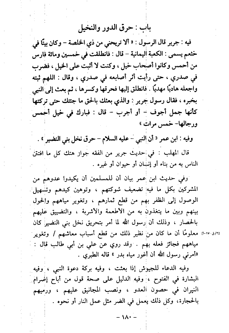 847 / فيه: جَرِيرٌ، قَالَ الرسول (صلى الله عليه وسلم) : (أَلا تُرِيحُنِى مِنْ ذِى الْخَلَصَةِ؟ - وَكَانَ بَيْتًا فِى خَثْعَمَ يُسَمَّى كَعْبَةَ الْيَمَانِيَةِ - قَالَ: فَانْطَلَقْتُ فِى خَمْسِينَ وَمِائَةِ فَارِسٍ مِنْ أَحْمَسَ، وَكَانُوا أَصْحَابَ خَيْلٍ، قَالَ: وَكُنْتُ لا أَثْبُتُ عَلَى الْخَيْلِ، فَضَرَبَ فِى صَدْرِى، حَتَّى رَأَيْتُ أَثَرَ أَصَابِعِهِ فِى صَدْرِى، وَقَالَ: (اللَّهُمَّ ثَبِّتْهُ، وَاجْعَلْهُ هَادِيًا مَهْدِيًّا) ، فَانْطَلَقَ إِلَيْهَا فَحَرَّقَهَا وَكَسَرَهَا، ثُمَّ بَعَثَ إِلَى النَّبِىّ (صلى الله عليه وسلم) يُخْبِرُهُ، فَقَالَ رَسُولُ جَرِيرٍ: وَالَّذِى بَعَثَكَ بِالْحَقِّ مَا جِئْتُكَ حَتَّى تَرَكْتُهَا، كَأَنَّهَا جَمَلٌ أَجْوَفُ - أَوْ أَجْرَبُ - قَالَ: (فَبَارَكَ فِى خَيْلِ أَحْمَسَ، وَرِجَالِهَا، خَمْسَ مَرَّاتٍ) . 1848 / وفيه: ابْن عُمَرَ، أن النَّبِىّ، (صلى الله عليه وسلم) ، حَرَّقَ نَخْلَ بَنِى النَّضِيرِ. قال المهلب: فى حديث جرير من الفقه جواز هتك كل ما افتتن الناس به من بناء أو إنسان أو حيوان أو غيره. وفى حديث ابن عمر بيان أن للمسلمين أن يكيدوا عدوهم من المشركين بكل ما فيه تضعيف شوكتهم، وتوهين كيدهم وتسهيل الوصول إلى الظفر بهم من قطع ثمارهم، وتغوير مياههم والحول بينهم وبين ما يتغذون به من الأطعمة والأشربة، والتضييق عليهم بالحصار، وذلك أن رسول الله لما أمر بتحريق نخل بنى النضير كان معلومًا أن ما كان من نظير ذلك من قطع أسباب معاشهم وتغوير مياههم فجائز فعله بهم. وقد روى عن على بن أبى طالب قال: (أمرنى رسول الله أن أغور مياه بدر) قاله الطبرى. وفيه الدعاء للجيوش إذا بعثت، وفيه بركة دعوة النبى، وفيه البشارة فى الفتوح، وفيه الدليل على صحة قول من أباح إضرام النيران فى حصون العدو، ونصب المجانيق عليهم، ورميهم بالحجارة، وكل ذلك يعمل فى الضر مثل عمل النار أو نحوه.