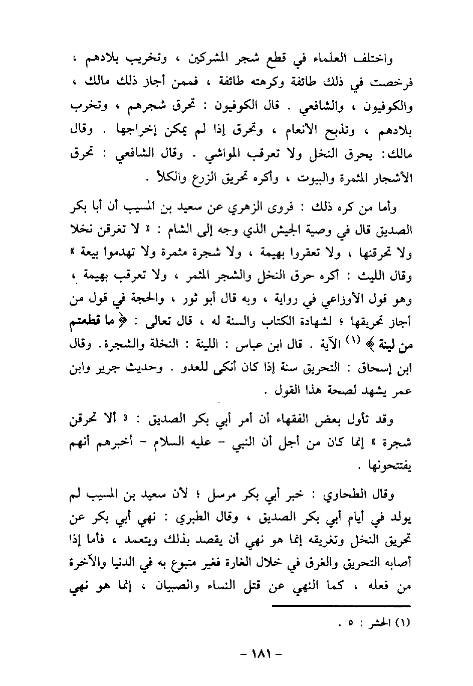 واختلف العلماء فى قطع شجر المشركين، وتخريب بلادهم، فرخصت فى ذلك طائفة وكرهته طائفة، فممن أجاز ذلك مالك، والكوفيون، والشافعي. قال الكوفيون: تحرق شجرهم، وتخرب بلادهم، وتذبح الأنعام، وتحرق إذا لم يمكن إخراجها. وقال مالك: يحرق النخل ولا تعرقب المواشي. وقال الشافعى: تحرق الأشجار المثمرة والبيوت، وأكره تحريق الزرع والكلأ. وأما من كره ذلك: فروى الزهرى عن سعيد بن المسيب أن أبا بكر الصديق قال فى وصية الجيش الذى وجه إلى الشام: (لا تغرقن نخلا ولا تحرقنها، ولا تعقروا بهيمة، ولا شجرة مثمرة ولا تهدموا بيعة) وقال الليث: أكره حرق النخل والشجر المثمر، ولا تعرقب بهيمة، وهو قول الأوزاعى فى رواية، وبه قال أبو ثور، والحجة فى قول من أجاز تحريقها؛ لشهادة الكتاب والسنة له، قال تعالى: (ما قطعتم من لينة (الآية. قال ابن عباس: اللينة: النخلة والشجرة. وقال ابن إسحاق: التحريق سنة إذا كان أنكى للعدو. وحديث جرير وابن عمر يشهد لصحة هذا القول. وقد تأول بعض الفقهاء أن أمر أبى بكر الصديق: (ألا تحرقن شجرة) إنما كان من أجل أن النبى (صلى الله عليه وسلم) أخبرهم أنهم يفتتحونها. وقال الطحاوى: خبر أبى بكر مرسل؛ لأن سعيد بن المسيب لم يولد فى أيام أبى بكر الصديق، وقال الطبرى: نهى أبى بكر عن تحريق النخل وتغريقه إنما هو نهى أن يقصد بذلك ويتعمد، فأما إذا أصابه التحريق والغرق فى خلال الغارة فغير متبوع به فى الدنيا والآخرة من فعله، كما النهى عن قتل النساء والصبيان، إنما هو نهى