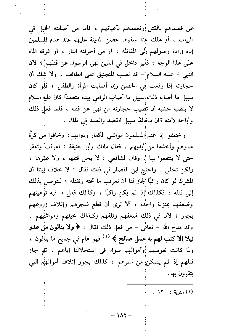 عن قصدهم بالقتل وتعمدهم بأعيانهم، فأما من أصابته الخيل فى البيات، أو هلك عند سقوط حصن المدينة عليهم عند هدم المسلمين إياه إرادة وصولهم إلى المقاتلة، أو من أحرقته النار، أو غرقه الماء على هذا الوجه؛ فغير داخل فى الذين نهى الرسول عن قتلهم؛ لأن النبى (صلى الله عليه وسلم) قد نصب المنجنيق على الطائف، ولا شك أن حجارته إذا وقعت فى الحصن ربما أصابت المرأة والطفل، فلو كان سبيل ما أصابه ذلك سبيل ما أصاب الرامى بيده متعمدًا كان (صلى الله عليه وسلم) لا ينصبه خشية أن تصيب حجارته من نهى عن قتله، فلما فعل ذلك وأباحه لأمته كان مخالفًا سبيل القصد والعمد فى ذلك. واختلفوا إذا غنم المسلمون مواشى الكفار ودوابهم، وخافوا من كرة عدوهم وأخذها من أيديهم. فقال مالك وأبو حنيفة: تعرقب وتعقر حتى لا ينتفعوا بها. وقال الشافعى: لا يحل قتلها، ولا عقرها، ولكن تخلى. واحتج ابن القصار فى ذلك فقال: لا خلاف بيننا أن المشرك لو كان راكبًا لجاز لنا أن نعرقب ما تحته ونقتله؛ لنتوصل بذلك إلى قتله، فكذلك إذا لم يكن راكبًا، وكذلك فعل ما فيه توهينهم وضعفهم بمنزلة واحدة؛ ألا ترى أن قطع شجرهم وإتلاف زروعهم يجوز؛ لأن فى ذلك ضعفهم وتلفهم وكذلك خيلهم ومواشيهم وقد مدح الله تعالى من فعل ذلك فقال: (ولا ينالون من عدو نيلا إلا كتب لهم به عمل صالح (فهو عام فى جميع ما ينالون ولما كانت نفوسهم وأموالهم سواء فى استحلالنا إياهم ثم جاز قتلهم إذا لم يتمكن من أسرهم كذلك يجوز إتلاف أموالهم التى يتقوون بها.