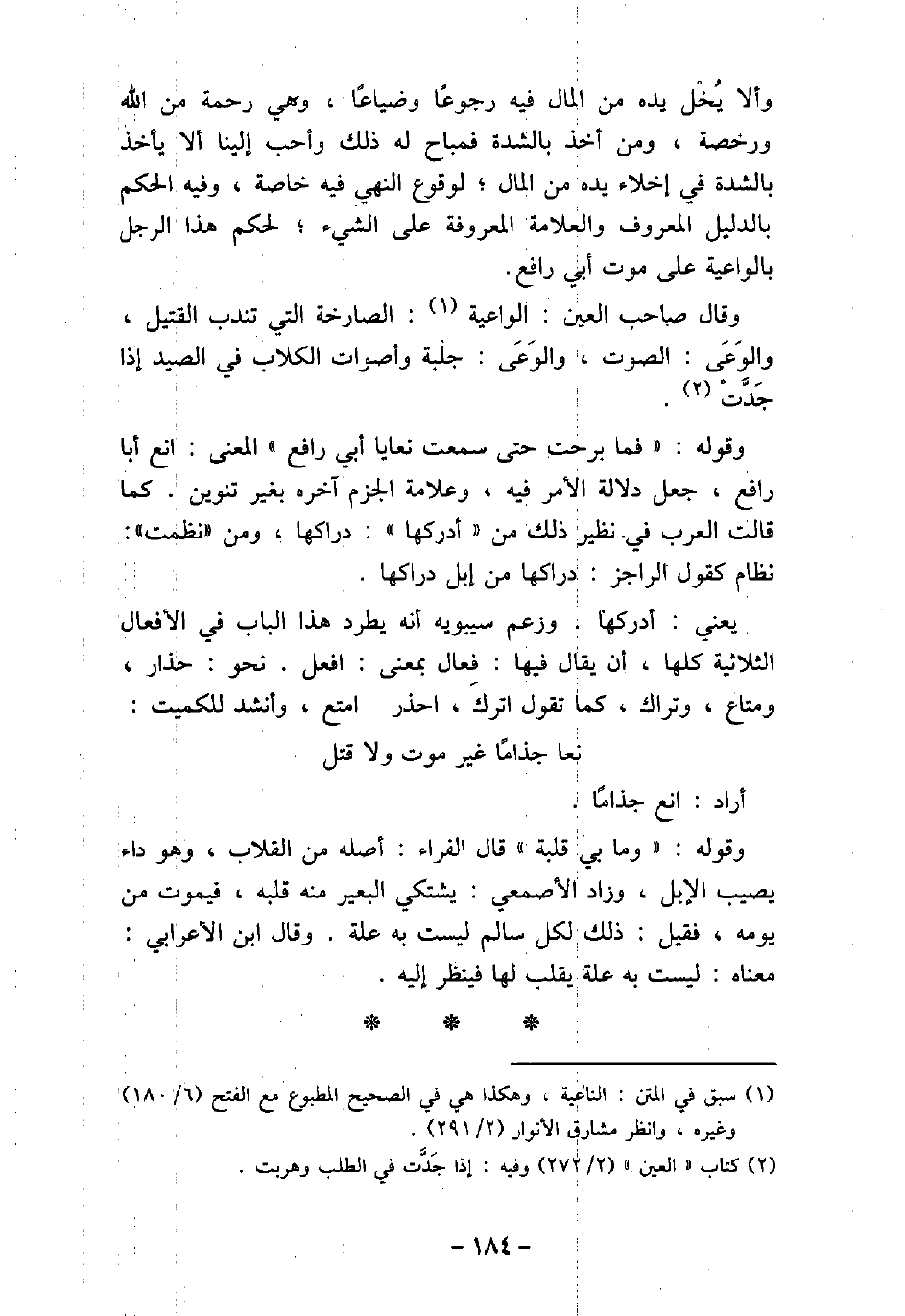 وألا يخل يده من المال فيه رجوعًا وضياعًا، وهى رحمة من الله ورخصة، ومن أخذ بالشدة فمباح له ذلك وأحب إلينا ألا يأخذ بالشدة فى إخلاء يده من المال؛ لوقوع النهى فيه خاصة، وفيه الحكم بالدليل المعروف والعلامة المعروفة على الشيء؛ لحكم هذا الرجل بالواعية على موت أبى رافع. وقال صاحب العين: الواعية: الصارخة التى تندب القتيل، والواعى: الصوت، والوعى: جلبة وأصوات الكلاب فى الصيد إذا جدت. وقوله: (فما برحت حتى سمعت نعايا أبى رافع) المعنى: انع أبا رافع، جعل دلالة الأمر فيه، وعلامة الجزم آخره بغير تنوين. كما قالت العرب فى نظير ذلك من (أدركها) : دراكها، ومن (نظمت) : نظام كقول الراجز: دراكها من إبل دراكها يعنى: أدركها. وزعم سيبويه أنه يطرد هذا الباب فى الأفعال الثلاثية كلها، أن يقال فيها: فعال بمعنى: افعل. نحو: حذار، ومتاع، وتراك، كما تقول اترك، احذر امتع، وأنشد للكميت: نعا جذامًا غير موت ولا قتل أراد: انع جذامًا. وقوله: (وما بى قلبة) قال الفراء: أصله من القلاب، وهو داء يصيب الإبل، وزاد الأصمعى: يشتكى البعير منه قلبه، فيموت من يومه، فقيل: ذلك لكل سالم ليست به علة. وقال ابن الأعرابى: معناه: ليست به علة يقلب لها فينظر إليه.