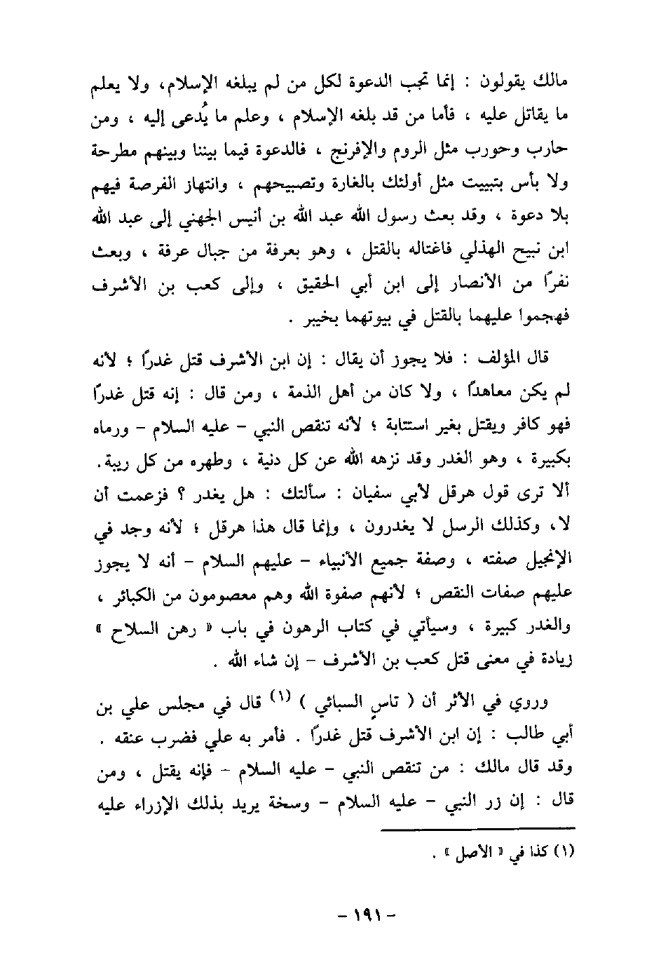 مالك يقولون: إنما تجب الدعوة لكل من لم يبلغه الإسلام، ولا يعلم ما يقاتل عليه، فأما من قد بلغه الإسلام، وعلم ما يدعى إليه، ومن حارب وحورب مثل الروم والإفرنج، فالدعوة فيما بيننا وبينهم مطرحة ولا بأس بتبييت مثل أولئك بالغارة وتصبيحهم، وانتهاز الفرصة فيهم بلا دعوة، وقد بعث رسول الله عبد الله بن أنيس الجهنى إلى عبد الله ابن نبيح الهذلى فاغتاله بالقتل، وهو بعرفة من جبال عرفة، وبعث نفرًا من الأنصار إلى ابن أبى الحقيق، وإلى كعب بن الأشرف فهجموا عليهما بالقتل فى بيوتهما بخيبر. قال المؤلف: فلا يجوز أن يقال: إن ابن الأشرف قتل غدرًا؛ لأنه لم يكن معاهدًا، ولا كان من أهل الذمة، ومن قال: إنه قتل غدرًا فهو كافر ويقتل بغير استتابة؛ لأنه تنقص النبى (صلى الله عليه وسلم) ورماه بكبيرة، وهو الغدر وقد نزهه الله عن كل دنية، وطهره من كل ريبة. ألا ترى قول هرقل لأبى سفيان: سألتك: هل يغدر؟ فزعمت أن لا، وكذلك الرسل لا يغدرون، وإنما قال هذا هرقل؛ لأنه وجد فى الإنجيل صفته، وصفة جميع الأنبياء عليهم السلام أنه لا يجوز عليهم صفات النقص؛ لأنهم صفوة الله وهم معصومون من الكبائر، والغدر كبيرة، وسيأتى فى كتاب الرهون فى باب (رهن السلاح) زيادة فى معنى قتل كعب بن الأشرف إن شاء الله. وروى فى الأثر أن (تاس السبائى) قال فى مجلس على بن أبى طالب: إن ابن الأشرف قتل غدرًا. فأمر به على فضرب عنقه. وقد قال مالك: من تنقص النبى (صلى الله عليه وسلم) فإنه يقتل، ومن قال: إن زر النبى (صلى الله عليه وسلم) وسخة يريد بذلك الإزراء عليه