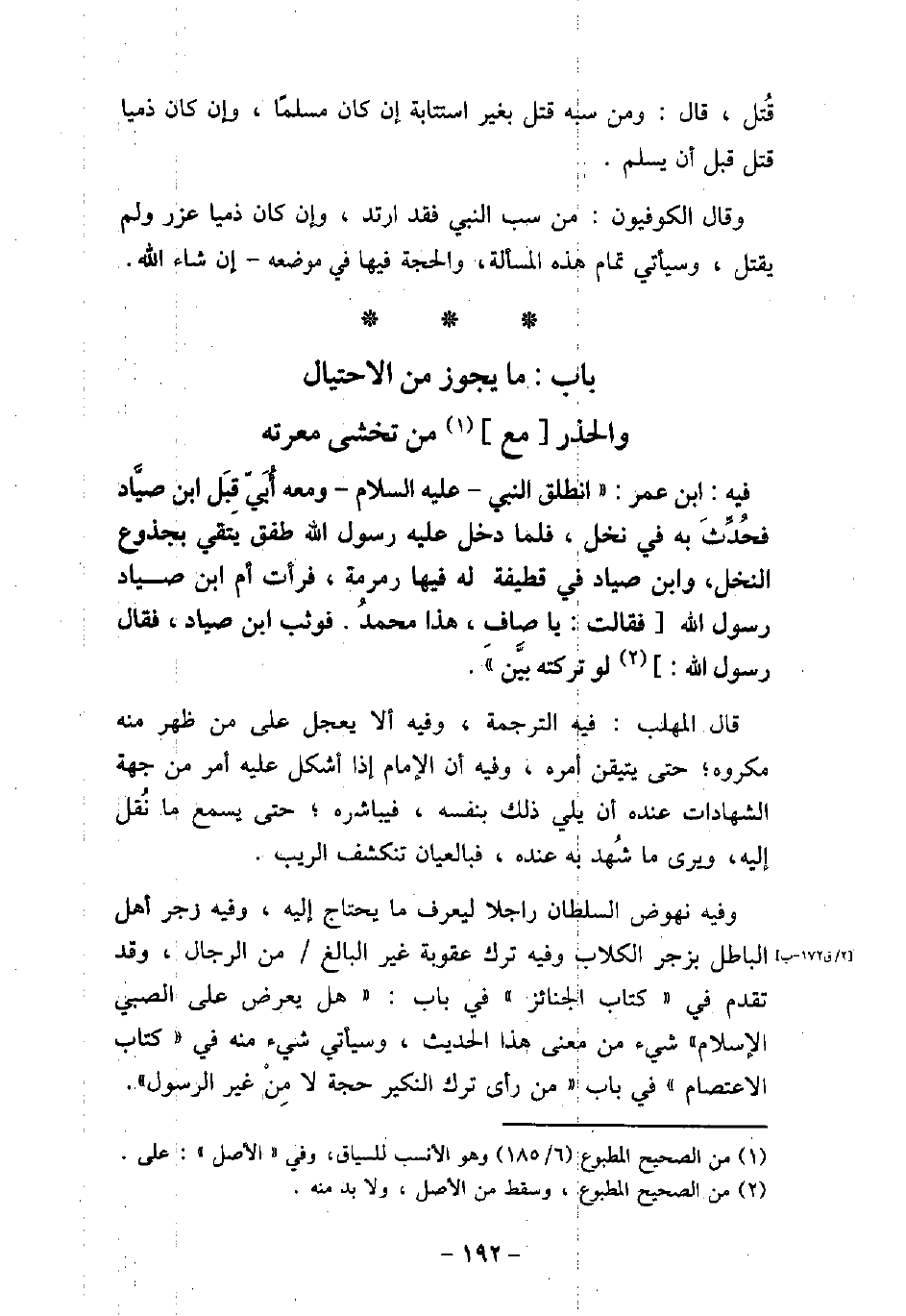 856 / - فيه: ابْن عُمَرَ، انْطَلَقَ النَّبِىّ، (صلى الله عليه وسلم) ، وَمَعَهُ أُبَىُّ قِبَلَ ابْنِ صَيَّادٍ، فَحُدِّثَ بِهِ فِى نَخْلٍ، فَلَمَّا دَخَلَ عَلَيْهِ رَسُولُ اللَّهِ طَفِقَ يَتَّقِى بِجُذُوعِ النَّخْلِ، وَابْنُ صَيَّادٍ فِى قَطِيفَةٍ لَهُ فِيهَا رَمْرَمَةٌ، فَرَأَتْ أُمُّ ابْنِ صَيَّادٍ رَسُولَ اللَّهِ (صلى الله عليه وسلم) ، فَقَالَتْ: يَا صَافِ، هَذَا مُحَمَّدٌ، فَوَثَبَ ابْنُ صَيَّادٍ، فَقَالَ رَسُولُ اللَّهِ (صلى الله عليه وسلم) : (لَوْ تَرَكَتْهُ بَيَّنَ) . قال المهلب: فيه الترجمة، وفيه ألا يجعل على من ظهر منه مكروه؛ حتى يتيقن أمره، وفيه أن الإمام إذا أشكل عليه أمر من جهة الشهادات عنده أن يلى ذلك بنفسه، فيباشره؛ حتى يسمع ما نقل إليه ويرى ما شهد به عنده، فبالعيان تنكشف الريب. وفيه نهوض السلطان راجلا ليعرف ما يحتاج إليه، وفيه زجر أهل الباطل بزجر الكلاب، وفيه ترك عقوبة غير البالغ من الرجال، وقد تقدم فى (كتاب الجنائز) فى باب: (هل يعرض على الصبى الإسلام) شيء من معنى هذا الحديث، وسيأتى شيء منه فى (كتاب الاعتصام) فى باب (من رأى ترك النكير حجة لا من غير الرسول) .