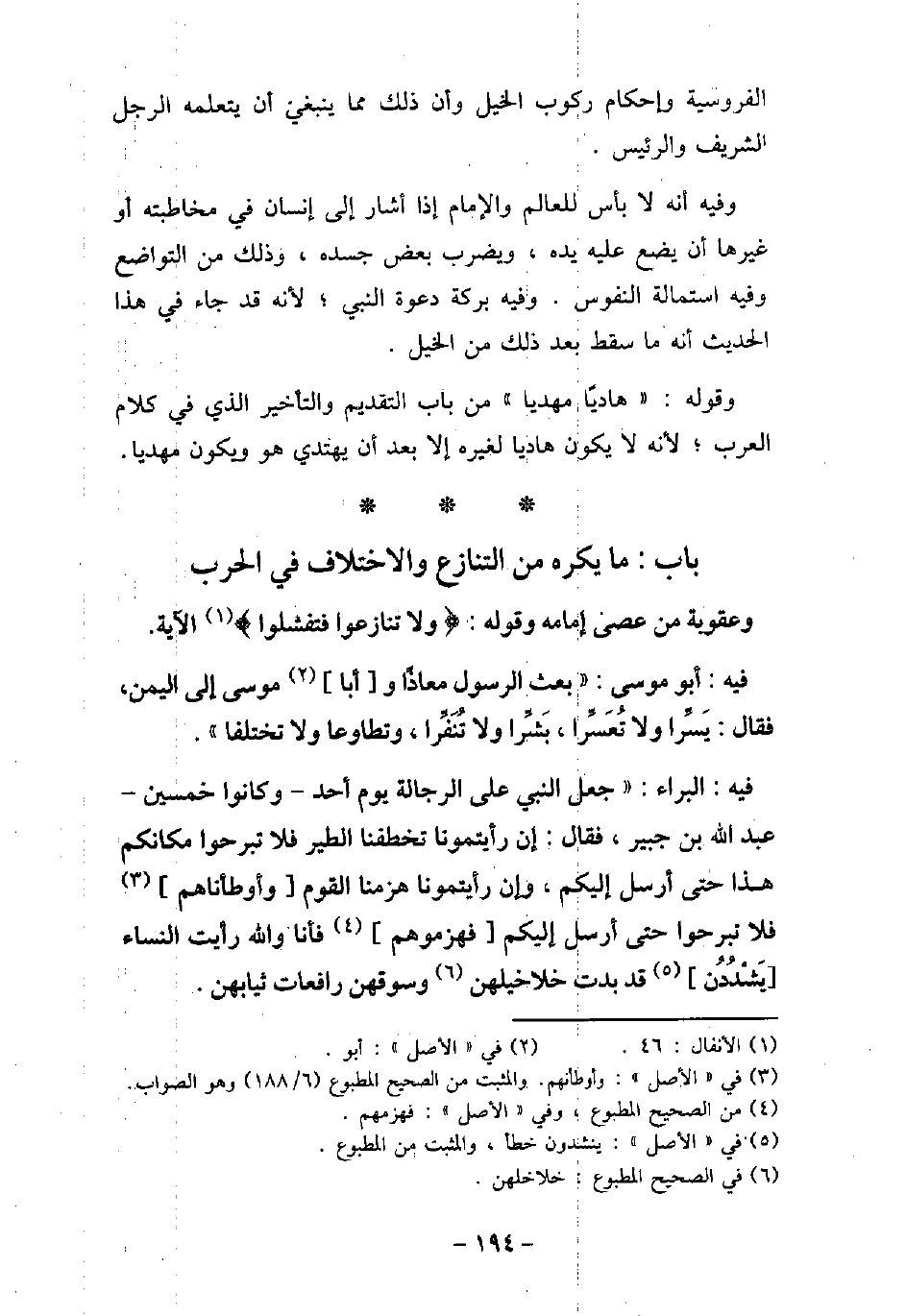 860 / فيه: أَبُو مُوسى، بَعَثَ الرسول (صلى الله عليه وسلم) مُعَاذًا وَأَبَا مُوسَى إِلَى الْيَمَنِ، فَقَالَ: (يَسِّرَا وَلا تُعَسِّرَا، وَبَشِّرَا وَلا تُنَفِّرَا، وَتَطَاوَعَا وَلا تَخْتَلِفَا) . 1861 / فيه: الْبَرَاءَ، جَعَلَ النَّبِىُّ، عَلَى الرَّجَّالَةِ يَوْمَ أُحُدٍ - وَكَانُوا خَمْسِينَ رَجُلا - عَبْدَاللَّهِ بْنَ جُبَيْرٍ، فَقَالَ: (إِنْ رَأَيْتُمُونَا تَخْطَفُنَا الطَّيْرُ، فَلا تَبْرَحُوا مَكَانَكُمْ هَذَا، حَتَّى أُرْسِلَ إِلَيْكُمْ، وَإِنْ رَأَيْتُمُونَا هَزَمْنَا الْقَوْمَ وَأَوْطَأْنَاهُمْ، فَلا تَبْرَحُوا حَتَّى أُرْسِلَ إِلَيْكُمْ) ، فَهَزَمُوهُمْ، قَالَ: فَأَنَا وَاللَّهِ رَأَيْتُ النِّسَاءَ يَشْدُدُنَ، قَدْ بَدَتْ خَلاخِلُهُنَّ وَسْوُقُهُنَّ، رَافِعَاتٍ ثِيَابَهُنَّ،