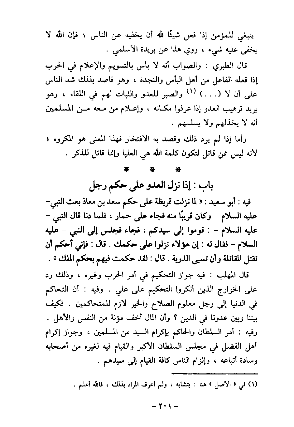 864 / فيه: أَبُو سَعِيد، لَمَّا نَزَلَتْ بَنُو قُرَيْظَةَ عَلَى حُكْمِ سَعْدٍ بْن مُعَاذٍ، بَعَثَ النَّبِىّ، (صلى الله عليه وسلم) ، وَكَانَ قَرِيبًا مِنْهُ، فَجَاءَ عَلَى حِمَارٍ، فَلَمَّا دَنَا، قَالَ النَّبِىّ، (صلى الله عليه وسلم) : (قُومُوا إِلَى سَيِّدِكُمْ) ، فَجَاءَ فَجَلَسَ إِلَى النَّبِىّ، (صلى الله عليه وسلم) ، فَقَالَ لَهُ: (إِنَّ هَؤُلاءِ نَزَلُوا عَلَى حُكْمِكَ) ، قَالَ: فَإِنِّى أَحْكُمُ أَنْ تُقْتَلَ الْمُقَاتِلَةُ، وَأَنْ تُسْبَى الذُّرِّيَّةُ، قَالَ: (لَقَدْ حَكَمْتَ فِيهِمْ بِحُكْمِ الْمَلِكِ) . قال المهلب: فيه جواز التحكيم فى أمر الحرب وغيره، وذلك رد على الخوارج الذين أنكروا التحكيم على عليّ. وفيه: أن التحاكم فى الدنيا إلى رجل معلوم الصلاح والخير لازم للمتحاكمين. فكيف بيننا وبين عدونا فى الدين؟ وأن المال أخف مؤنة من النفس والأهل. وفيه: أمر السلطان والحاكم بإكرام السيد من المسلمين، وجواز إكرام أهل الفضل فى مجلس السلطان الأكبر والقيام فيه لغيره من أصحابه وسادة أتباعه، وإلزام الناس كافة القيام إلى سيدهم.