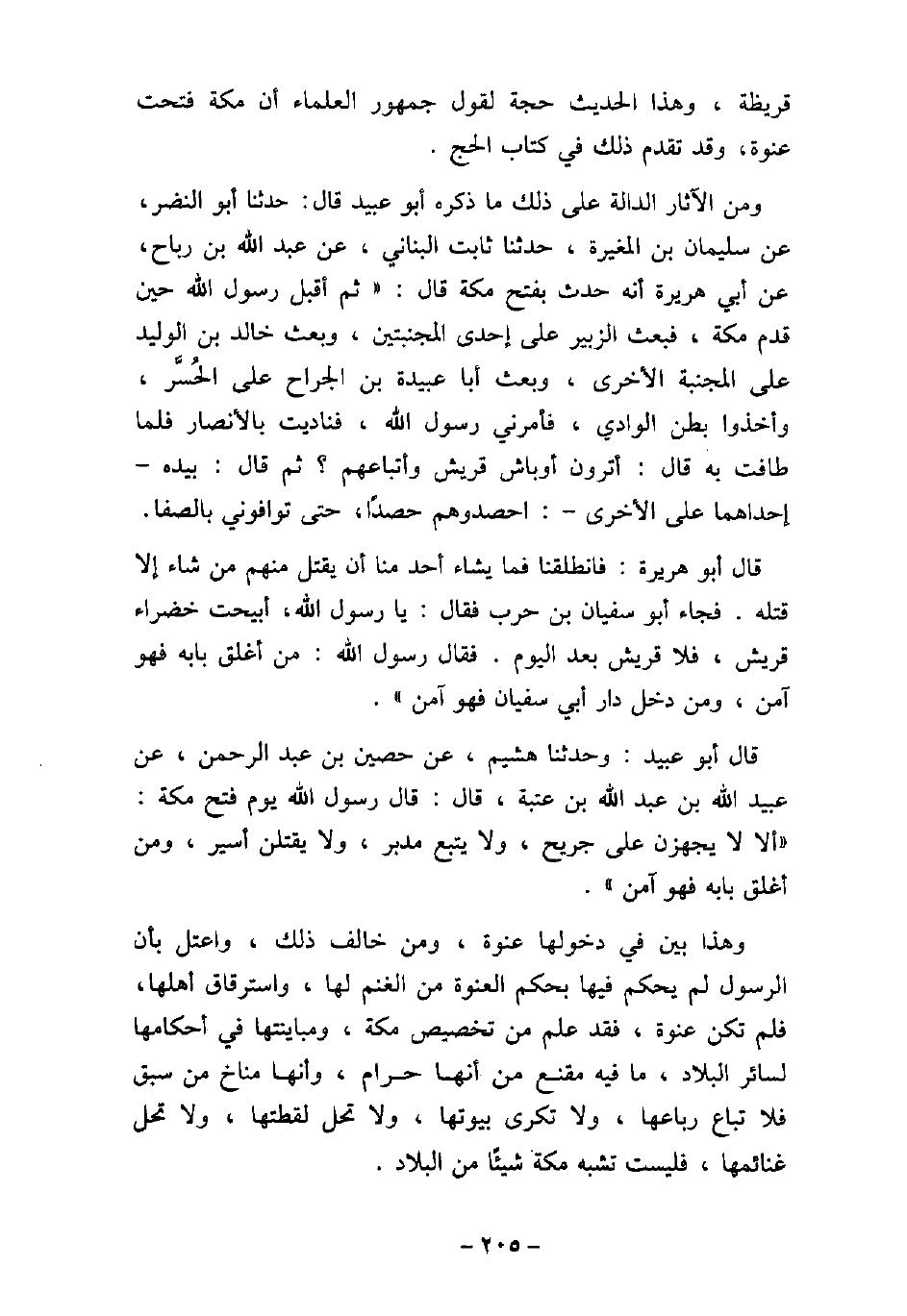 قريظة، وهذا الحديث حجة لقول جمهور العلماء أن مكة فتحت عنوة، وقد تقدم ذلك فى كتاب الحج. ومن الآثار الدالة على ذلك ما ذكره أبو عبيد قال: حدثنا أبو النضر، عن سليمان بن المغيرة، حدثنا ثابت البنانى، عن عبد الله بن رباح، عن أبى هريرة أنه حدث بفتح مكة قال: (ثم أقبل رسول الله حين قدم مكة، فبعث الزبير على إحدى المجنبتين، وبعث خالد ابن الوليد على المجنبة الأخرى، وبعث أبا عبيدة بن الجراح على الحسر، وأخذوا بطن الوادى، فأمرنى رسول الله، فناديت بالأنصار فلما طافت به قال: أترون أوباش قريش وأتباعهم؟ ثم قال: بيده إحداهما على الأخرى -: احصدوهم حصدًا، حتى توافونى بالصفا. قال أبو هريرة: فانطلقنا فما يشاء أحد منا أن يقتل منهم من شاء إلا قتله. فجاء أبو سفيان بن حرب فقال: يا رسول الله، أبيحت خضراء قريش، فلا قريش بعد اليوم. فقال رسول الله: من أغلق بابه فهو آمن، ومن دخل دار أبى سفيان فهو آمن) . قال أبو عبيد: حدثنا هشيم، عن حصين بن عبد الرحمن، عن عبيد الله بن عبد الله ابن عتبة، قال: قال رسول اله يوم فتح مكة: (ألا لا يجهزن على جريح، ولا يتبع مدبر، ولا يقتلن أسير، ومن أغلق بابه فهو آمن) . وهذا بين فى دخولها عنوة، ومن خالف ذلك، واعتل بأن الرسول لم يحكم فيها بحكم العنوة من الغنم لها، واسترقاق أهلها، فلم تكن عنوة، فقد علم من تخصيص مكة، ومباينتها فى أحكامها لسائر البلاد، ما فيه مقنع من أنها حرام، وأنها مناخ من سبق فلا تباع رباعها، ولا تكرى بيوتها، ولا تحل لقطتها، ولا تحل غنائمها، فليست تشبه مكة شيئًا من البلاد