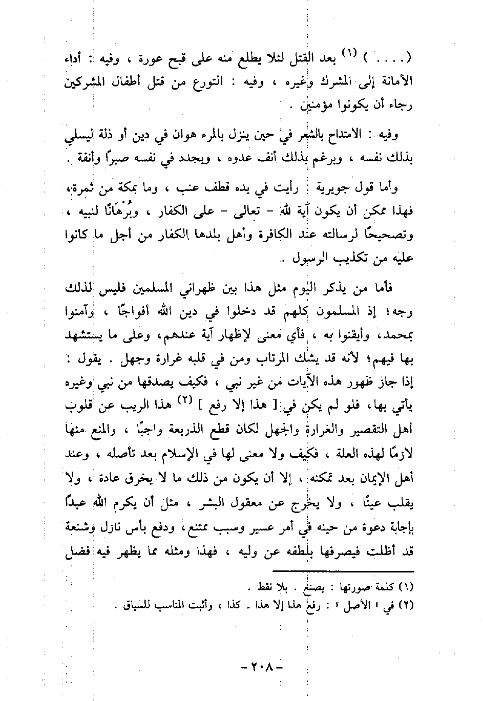 [. . . . .] بعد القتل لئلا يطلع منه على قبح عورة، وفيه: أداء الأمانة إلى المشرك وغيره، وفيه: التورع من قتل أطفال المشركين رجاء أن يكونوا مؤمنين. وفيه: الامتداح بالشعر فى حين ينزل بالمرء هوان فى دين أو ذلة ليسلى بذلك نفسه، ويرغم بذلك أنف عدوه، ويجدد فى نفسه صبرًا وأنفة. وأما قول جويرية: رأيت فى يده قطف عنب، وما بمكة من ثمرة، فهذا ممكن أن يكون آية لله تعالى على الكفار، وبرهانًا لنبيه، وتصحيحًا لرسالته عند الكافرة وأهل بلدها الكفار من أجل ما كانوا عليه من تكذيب الرسول. فأما من يذكر اليوم مثل هذا بين ظهرانى المسلمين فليس لذلك وجه؛ إذ المسلمون كلهم قد دخلوا فى دين الله أفواجًا، وآمنوا بمحمد، وأيقنوا به، فأى معنى لإظهار آية عندهم، وعلى ما يستشهد بها فيهم؛ لأنه قد يشك المرتاب ومن فى قلبه غرارة وجهل. يقول: إذا جاز ظهور هذه الآيات من غير نبى، فكيف يصدقها من نبى وغيره يأتى بها، فلو لم يكن فى هذا إلا رفع هذا الريب عن قلوب أهل التقصير والغرارة والجهل لكان قطع الذريعة واجبًا، والمنع منها لازمًا لهذه العلة، فكيف ولا معنى لها فى الإسلام بعد تأصله، وعند أهل الإيمان بعد تمكنه، إلا أن يكون من ذلك ما لا يخرق عادة، ولا يقلب عينًا، ولا يخرج عن معقول البشر، مثل أن يكرم الله عبدًا بإجابة دعوة من حينه فى أمر عسير وسبب ممتنع، ودفع بأس نازل وشنعة قد أظلت فيصرفها بلطفه عن وليه، فهذا ومثله مما يظهر فيه فضل