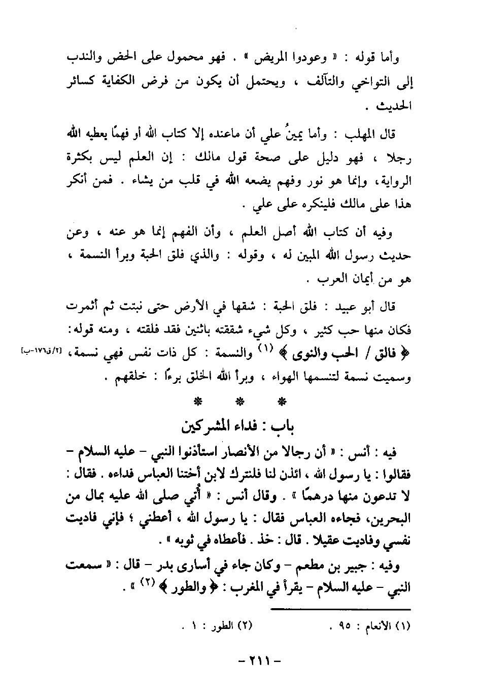 وأما قوله: (وعودوا المريض) . فهو محمول على الحض والندب إلى التواخى والتآلف، ويحتمل أن يكون من فرض الكفاية كسائر الحديث. قال المهلب: وأما يمين على أن ما عنده إلا كتاب الله أو فهما يعطيه الله رجلا، فهو دليلا على صحة قول مالك: إن العلم ليس بكثرة الرواية، وإنما هو نور وفهم يضعه الله فى قلب من يشاء. فمن أنكر هذا على مالك فلينكره على عليّ. وفيه أن كتاب الله أصل العلم، وأن الفهم إنما هو عنه، وعن حديث رسول الله المبين له، وقوله: والذى فلق الحبة وبرأ النسمة، هو من أيمان العرب. قال أبو عبيد: فلق الحبة: شقها فى الأرض حتى نبتت ثم أثمرت فكان منها حب كثير، وكل شيء شققته باثنين فقد فلقته، ومنه قوله: (فالق الحب والنوى (والنسمة: كل ذات نفس فهى نسمة، وسميت نسمة لتنسمها الهواء، وبرأ الله الخلق برءًا: خلقهم.
