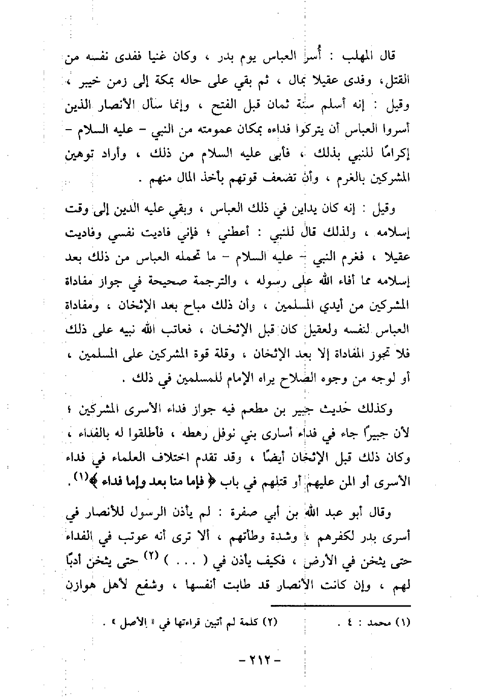 قال المهلب: أسر العباس يوم بدر، وكان غنيا ففدى نفسه من القتل، وفدى عقيلا بمال، ثم بقى على حاله بمكة إلى زمن خيبر، وقيل: إنه أسلم سنة ثمان قبل الفتح، وإنما سأل الأنصار الذين أسروا العباس أن يتركوا فداءه بمكان عمومه من النبى (صلى الله عليه وسلم) إكرامًا للنبى بذلك، فأبى (صلى الله عليه وسلم) من ذلك، وأراد توهين المشركين بالغرم، وأن تضعف قوتهم بأخذ المال منهم. وقيل: إنه كان يداين فى ذلك العباس، وبقى عليه الدين إلى وقت إسلامه، ولذلك قال للنبى: أعطنى؛ فإنى فاديت نفسى وفاديت عقيلا، فغرم النبى (صلى الله عليه وسلم) ما تحمله العباس من ذلك بعد إسلامه مما أفاء الله على رسوله، والترجمة صحيحة فى جواز مفاداة المشركين من أيدى المسلمين، وأن ذلك مباح بعد الإثخان، ومفاداة العباس لنفسه ولعقيل كان قبل الإثخان، فعاتب الله نبيه على ذلك فلا تجوز المفاداة إلا بعد الإثخان، وقلة قوة المشركين على المسلمين، أو لوجه من وجوه الصلاح يراه الإمام للمسلمين فى ذلك. وكذلك حديث جبير بن مطعم فيه جواز فداء الأسرى المشركين؛ لأن جبيرًا جاء فى فداء أسارى بنى نوفل رهطه، فأطلقوا له بالفداء، وكان ذلك قبل الإثخان أيضًا، وقد تقدم اختلاف العلماء فى فداء الأسرى أو المن عليهم أو قتلهم فى باب) فإما منا بعد وإما فداء (. وقال أبو عبد الله بن أبى صفرة: لم يأذن الرسول للأنصار فى أسرى بدر لكفرهم، وشدة وطأتهم، ألا ترى أنه عوتب فى الفداء حتى يثخن فى الأرض، فكيف يأذن فى [. . . .] حتى يثخن أدبًا لهم، وإن كانت الأنصار قد طابت أنفسها، وشفع لأهل هوازن