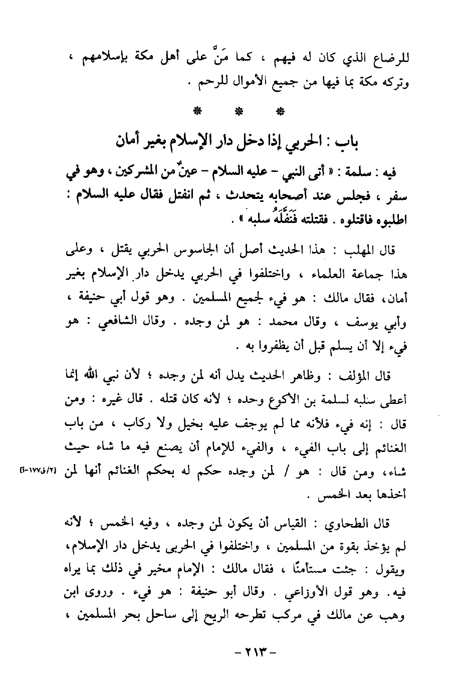 871 / فيه: سَلَمَةَ، أَتَى النَّبِىَّ؛ (صلى الله عليه وسلم) ، عَيْنٌ مِنَ الْمُشْرِكِينَ، وَهُوَ فِى سَفَرٍ، فَجَلَسَ عِنْدَ أَصْحَابِهِ يَتَحَدَّثُ، ثُمَّ انْفَتَلَ، فَقَالَ (صلى الله عليه وسلم) : (اطْلُبُوهُ فَاقْتُلُوهُ) ، فَقَتَلَهُ، فَنَفَّلَهُ سَلَبَهُ. قال المهلب: هذا الحديث أصل أن الجاسوس الحربى يقتل، وعلى هذا جماعة العلماء، واختلفوا فى الحربى يدخل دار الإسلام بغير أمان، فقال مالك: هو فيء لجميع المسلمين. وهو قول أبى حنيفة، وأبى يوسف، وقال محمد: هو لمن وجده. وقال الشافعى: هو فيء إلا أن يسلم قبل أن يظفروا به. قال المؤلف: وظاهر الحديث يدل أنه لمن وجده؛ لأن نبى الله إنما أعطى سلبه لسلمة ابن الأكوع وحده؛ لأنه كان قتله. قال غيره: ومن قال: إنه فيء فلأنه مما لم يوجف عليه بخيل ولا ركاب، من باب الغنائم إلى باب الفيء، والفيء للإمام أن يصنع فيه ما شاء حيث شاء، ومن قال: هو لمن وجده حكم له بحكم الغنائم أنها لمن أخذها بعد الخمس. قال الطحاوى: القياس أن يكون لمن وجده، وفيه الخمس؛ لأنه لم يؤخذ بقوة من المسلمين، واختلفوا فى الحربى يدخل دار الإسلام، ويقول: جئت مستأمنا، فقال مالك: الإمام مخير فى ذلك بما يراه فيه. وهو قول الأوزاعي. وقال أبو حنيفة: هو فيء. وروى ابن وهب عن مالك فى مركب تطرحه الريح إلى ساحل بحر المسلمين،