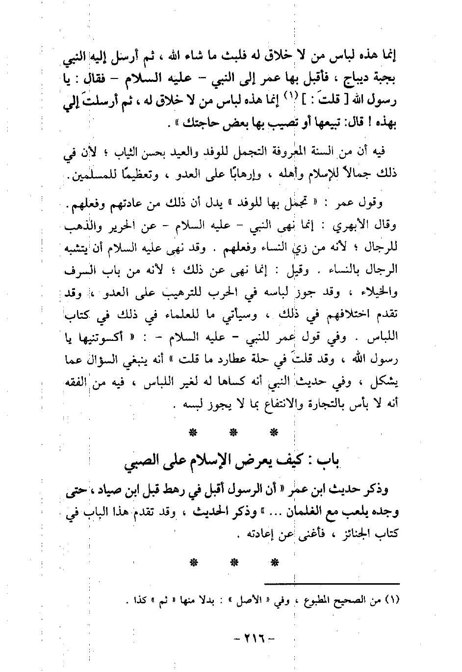(إِنَّمَا هَذِهِ لِبَاسُ مَنْ لا خَلاقَ لَهُ) ، فَلَبِثَ مَا شَاءَ اللَّهُ، ثُمَّ أَرْسَلَ إِلَيْهِ النَّبِىُّ (صلى الله عليه وسلم) بِجُبَّةِ دِيبَاجٍ، فَأَقْبَلَ بِهَا عُمَرُ إلى النَّبِىّ، (صلى الله عليه وسلم) ، فَقَالَ: يَا رَسُولَ اللَّهِ، قُلْتَ: إِنَّمَا هَذِهِ لِبَاسُ مَنْ لا خَلاقَ لَهُ، ثُمَّ أَرْسَلْتَ إِلَىَّ بِهَذِهِ، فَقَالَ: (تَبِيعُهَا، أَوْ تُصِيبُ بِهَا بَعْضَ حَاجَتِكَ) . فيه أن من السنة المعروفة التجمل للوفد والعيد بحسن الثياب؛ لأن فى ذلك جمالاً للإسلام وأهله، وإرهابًا على العدو، وتعظيمًا للمسلمين. وقول عمر: (تجمل بها للوفد) يدل أن ذلك من عادتهم وفعلهم. وقال الأبهرى: إنما نهى النبى (صلى الله عليه وسلم) عن الحرير والذهب للرجال؛ لأنه من زى النساء وفعلهم. وقد نهى (صلى الله عليه وسلم) أن يتشبه الرجال بالنساء. وقيل: إنما نهى عن ذلك؛ لأنه من باب السرف والخيلاء، وقد جوز لباسه فى الحرب للترهيب على العدو، وقد تقدم اختلافهم فى ذلك، وسيأتى ما للعلماء فى ذلك فى كتاب اللباس. وفى قول عمر للنبى (صلى الله عليه وسلم) -: (أكسوتنيها يا رسول الله، وقد قلت فى حلة عطارد ما قلت) أنه ينبغى السؤال عما يشكل، وفى حديث النبى أنه كساها له لغير اللباس، فيه من الفقه أنه لا بأس بالتجارة والانتفاع بما لا يجوز لبسه.