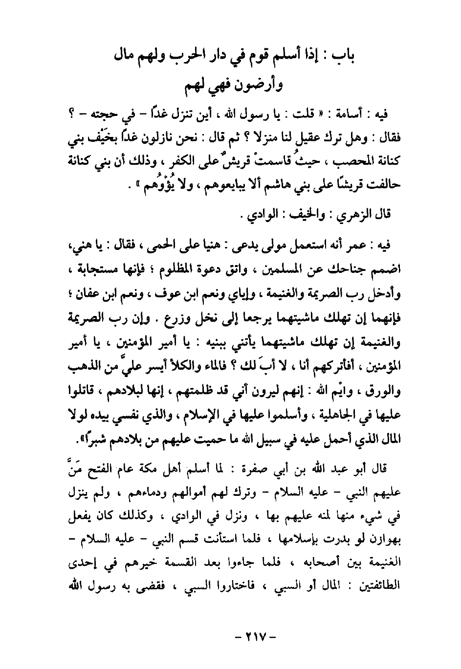 876 / فيه: أُسَامَةَ، قُلْتُ: يَا رَسُولَ اللَّهِ، أَيْنَ تَنْزِلُ غَدًا - فِى حَجَّتِهِ؟ - قَالَ: (وَهَلْ تَرَكَ عَقِيلٌ لَنَا مَنْزِلا) ؟ ثُمَّ قَالَ: (نَحْنُ نَازِلُونَ غَدًا بِخَيْفِ بَنِى كِنَانَةَ الْمُحَصَّبِ حَيْثُ قَاسَمَتْ قُرَيْشٌ عَلَى الْكُفْرِ) ، وَذَلِكَ أَنَّ بَنِى كِنَانَةَ حَالَفَتْ قُرَيْشًا عَلَى بَنِى هَاشِمٍ: أَنْ لا يُبَايِعُوهُمْ وَلا يُؤْوُوهُمْ. قَالَ الزُّهْرِىُّ: وَالْخَيْفُ: الْوَادِى. 1877 / فيه: عُمَرَ، أنَّهُ اسْتَعْمَلَ مَوْلًى يُدْعَى هُنَيًّا، عَلَى الْحِمَى، فَقَالَ: يَا هُنَىُّ، اضْمُمْ جَنَاحَكَ عَنِ الْمُسْلِمِينَ، وَاتَّقِ دَعْوَةَ الْمَظْلُومِ، فَإِنَّ دَعْوَةَ الْمَظْلُومِ مُسْتَجَابَةٌ، وَأَدْخِلْ رَبَّ الصُّرَيْمَةِ وَالْغُنَيْمَةِ، وَإِيَّاىَ وَنَعَمَ ابْنِ عَوْفٍ، وَنَعَمَ ابْنِ عَفَّانَ، فَإِنَّهُمَا إِنْ تَهْلِكْ مَاشِيَتُهُمَا يَرْجِعَا إِلَى نَخْلٍ وَزَرْعٍ، وَإِنَّ رَبَّ الصُّرَيْمَةِ وَالْغُنَيْمَةِ إِنْ تَهْلِكْ مَاشِيَتُهُمَا يَأْتِنِى بِبَنِيهِ، فَيَقُولُ: يَا أَمِيرَ الْمُؤْمِنِينَ، أَفَتَارِكُهُمْ أَنَا لا أَبَا لَكَ؟ فَالْمَاءُ وَالْكَلأ أَيْسَرُ عَلَىَّ مِنَ الذَّهَبِ وَالْوَرِقِ، وَايْمُ اللَّهِ إِنَّهُمْ لَيَرَوْنَ أَنِّى قَدْ ظَلَمْتُهُمْ إِنَّهَا لَبِلادُهُمْ، فَقَاتَلُوا عَلَيْهَا فِى الْجَاهِلِيَّةِ، وَأَسْلَمُوا عَلَيْهَا فِى الإسْلامِ، وَالَّذِى نَفْسِى بِيَدِهِ لَوْلا الْمَالُ الَّذِى أَحْمِلُ عَلَيْهِ فِى سَبِيلِ اللَّهِ مَا حَمَيْتُ عَلَيْهِمْ مِنْ بِلادِهِمْ شِبْرًا. قال أبو عبد الله بن أبى صفرة: لما أسلم أهل مكة عام الفتح مَنَّ عليهم النبى (صلى الله عليه وسلم) وترك لهم أموالهم ودماءهم، ولم ينزل فى شيء منها لمنه عليهم بها، ونزل فى الوادى، وكذلك كان يفعل بهوازن لو بدرت بإسلامها، فلما استأنت قسم النبى (صلى الله عليه وسلم) الغنيمة بين أصحابه، فلما جاءوا بعد القسمة خيرهم فى إحدى الطائفتين: المال أو السبى، فقضى به رسول الله