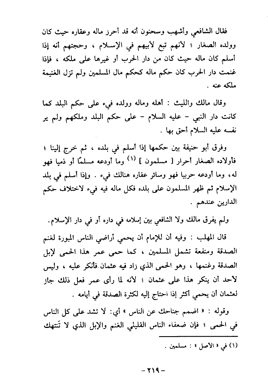 فقال الشافعى وأشهب وسحنون أنه قد أحرز ماله وعقاره حيث كان وولده الصغار؛ لأنهم تبع لأبيهم فى الإسلام، وحجتهم أنه إذا أسلم كان ماله حيث كان من دار الحرب أو غيرها على ملكه، فإذا غنمت دار الحرب كان حكم ماله كحكم مال المسلمين ولم تزل الغنيمة ملكه عنه. وقال مالك والليث: أهله وماله وولده فيء على حكم البلد كما كانت دار النبى (صلى الله عليه وسلم) على حكم البلد وملكهم ولم ير نفسه (صلى الله عليه وسلم) أحق بها. وفرق أبو حنيفة بين حكمها إذا أسلم فى بلده، ثم خرج إلينا؛ فأولاده الصغار أحرار مسلمون وما أودعه مسلمًا أو ذميا فهو له، وما أودعه حربيا فهو وسائر عقاره هنالك فيء. وإذا أسلم فى بلد الإسلام ثم ظهر المسلمون على بلده فكل ماله فيه فيء لاختلاف حكم الدارين عندهم. ولم يفرق مالك ولا الشافعى بين إسلامه فى داره أو فى دار الإسلام. قال المهلب: وفيه أن للإمام أن يحمى أراضى الناس المبورة لغنم الصدقة ومنفعة تشمل المسلمين، كما حمى عمر هذا الحمى لإبل الصدقة وغنمها، وهو الحمى الذى زاد فيه عثمان فأنكر عليه، وليس لأحد أن ينكر هذا على عثمان؛ لأنه لما رأى عمر فعل ذلك جاز لعثمان أن يحمى أكثر إذا احتاج إليه لكثرة الصدقة فى أيامه. وقوله: (اضمم جناحك عن الناس) أى: لا تشد على كل الناس فى الحمى؛ فإن ضعفاء الناس القليلى الغنم والإبل الذى لا تنتهك