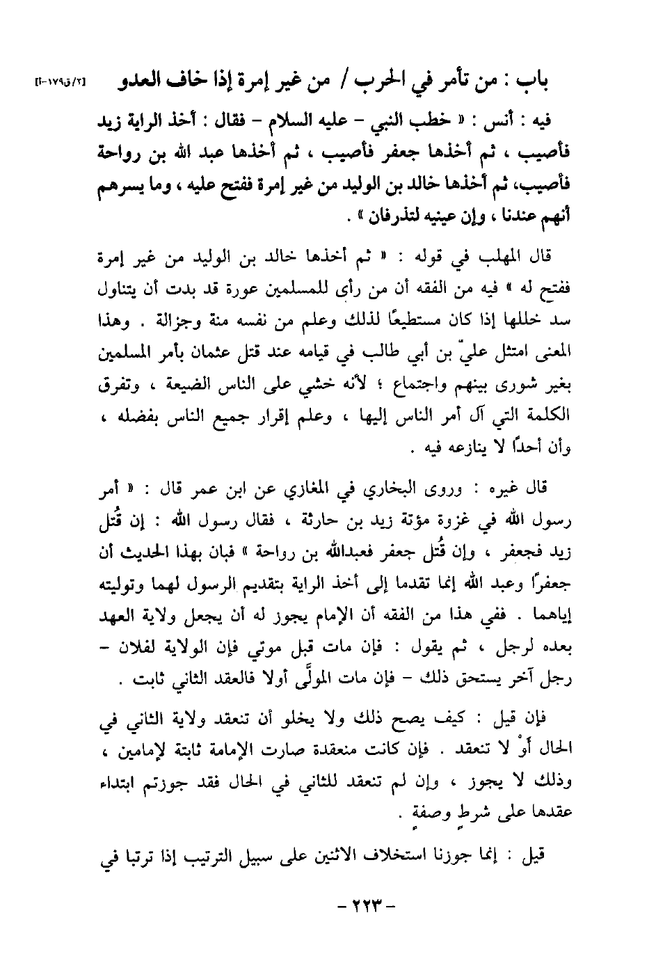 880 / فيه: أَنَس، خَطَبَ النَّبِىّ، (صلى الله عليه وسلم) ، فَقَالَ: (أَخَذَ الرَّايَةَ زَيْدٌ فَأُصِيبَ، ثُمَّ أَخَذَهَا جَعْفَرٌ فَأُصِيبَ، ثُمَّ أَخَذَهَا عَبْدُاللَّهِ بْنُ رَوَاحَةَ فَأُصِيبَ، ثُمَّ أَخَذَهَا خَالِدُ بْنُ الْوَلِيدِ عَنْ غَيْرِ إِمْرَةٍ، فَفُتِحَ عَلَيْهِ، وَمَا يَسُرُّهُمْ أَنَّهُمْ عِنْدَنَا) ، وَإِنَّ عَيْنَيْهِ لَتَذْرِفَانِ. قال المهلب: فى قوله: (ثم أخذها خالد بن الوليد من غير إمرة ففتح له) . فيه من الفقه أن من رأى للمسلمين عورة قد بدت أن يتناول سد خللها إذا كان مستطيعا لذلك وعلم من نفسه منة وجزالة وهذا المعنى امتثل على بن أبى طالب فى قيامه عند قتل عثمان بأمر المسلمين بغير شورى بينهم واجتماع لأنه خشى على الناس الضيعة وتفرق الكلمة التى آل أمر الناس أليها وعلم إقرار جميع الناس بفضله وأن أحدًا لا ينازعه فيه. قال غيره: وروى البخارى فى المغازى عن ابن عمر قال: أمر رسول الله فى غزوة مؤتة زيد بن حارثة فقال رسول الله: (إن قتل زيد فجعفر وإن قتل جعفر فعبد الله بن رواحه) فبان بهذا الحديث أن جعفرًا وعبد الله إنما تقدما إلى أخذ الراية بتقديم الرسول لهما وتوليته إياهما. ففى هذا من الفقه أن الإمام يجوز له أن يجعل ولاية العهد بعده لرجل، ثم يقول: فإن مات قبل موتى فإن الولاية لفلان رجل آخر يستحق ذلك فإن مات المولى أولا فالعقد الثانى ثابت. فإن قيل: كيف يصح ذلك ولا يخلو أن تنعقد ولاية الثانى فى الحال أو لا تنعقد. فإن كانت منعقدة صارت الإمامة ثابتة لإمامين، وذلك لا يجوز، وإن لم تنعقد للثانى فى الحال فقد جوزتم ابتداء عقدها على شرط وصفة. قيل: إنما جوزنا استخلاف الاثنين على سبيل الترتيب إذا ترتبا فى