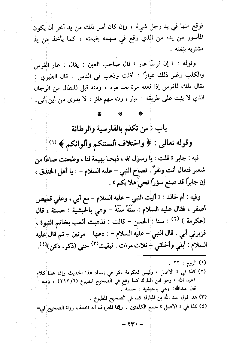 0 - باب مَنْ تَكَلَّمَ بِالْفَارِسِيَّةِ وَالرَّطَانَةِ وَقَوْلِهِ تَعَالَى: (وَاخْتِلافُ أَلْسِنَتِكُمْ وَأَلْوَانِكُمْ) [الروم: 22]