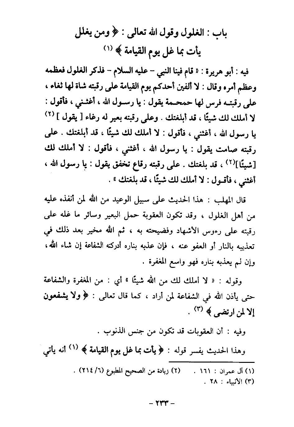 1 - باب الْغُلُولِ وَقَوْلِ اللَّهِ تَعَالَى: (وَمَنْ يَغْلُلْ يَأْتِ بِمَا غَلَّ يوم القيامة) [آل عمران: 161]
