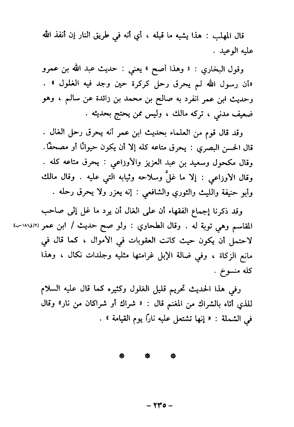 قال المهلب: هذا يشبه ما قبله، أى أنه فى طريق النار إن أنفذ الله عليه الوعيد. وقول البخارى: (وهذا أصح) يعى: حديث عبد الله بن عمرو (أن رسول الله لم يحرق رحل كركرة حين وجد فيه الغلول) . وحديث ابن عمر انفرد به صالح بن محمد بن زائدة عن سالم، وهو ضعيف مدنى، تركه مالك، وليس ممن يحتج بحديثه. وقد قال قوم من العلماء بحديث ابن عمر أنه يحرق رحل الغال. قال الحسن البصرى: يحرق متاعه كله إلا أن يكون حيوانًا أو مصحفًا. وقال مكحول وسعيد بن عبد العزيز والأوزاعى: يحرق متاعه كله. وقال الأوزاعى: إلا ما غل وسلاحه وثيابه التى عليه. وقال مالك وأبو حنيفة والليث والثورى والشافعى: إنه يعزر ولا يحرق رحله. وقد ذكرنا إجماع الفقهاء أن على الغال أن يرد ما غل إلى صاحب المقاسم وهى توبة له. وقال الطحاوى: ولو صح حديث ابن عمر لاحتمل أن يكون حيث كانت العقوبات فى الأموال، كما قال فى مانع الزكاة، وفى ضالة الإبل غرامتها مثليه وجلدات نكال، وهذا كله منسوخ. وفى هذا الحديث تحريم قليل الغلول وكثيره كما قال (صلى الله عليه وسلم) للذى أتاه بالشراك من المغنم قال: (شراك أو شراكان من نار) وقال فى الشملة: (إنها تشتعل عليه نارًا يوم القيامة) .