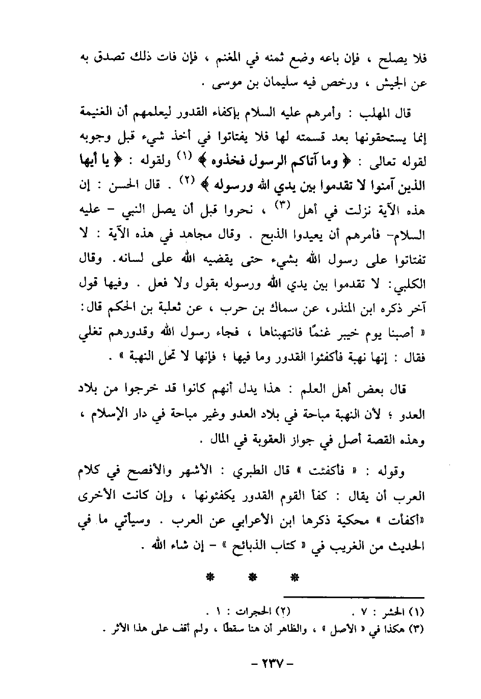 فلا يصلح، فإن باعه وضع ثمنه فى المغنم، فإن فات ذلك تصدق به عن الجيش، ورخص فيه سليمان بن موسى. قال المهلب: وأمرهم (صلى الله عليه وسلم) بإكفاء القدور ليعلمهم أن الغنيمة إنما يستحقونها بعد قسمته لها فلا يفتاتوا فى أخذ شيء قبل وجوبه لقوله تعالى: (وما آتاكم الرسول فخذوه (ولقوله: (يا أيها الذين آمنوا لا تقدموا بين يدى الله ورسوله (. قال الحسن: إن هذه الآية نزلت فى أهل، نحروا قبل أن يصل النبى (صلى الله عليه وسلم) فأمرهم أن يعيدوا الذبح. وقال مجاهد فى هذه الآية: لا تفتاتوا على رسول الله بشيء حتى يقضيه الله على لسانه. وقال الكلبى: لا تقدموا بين يدى الله ورسوله بقول ولا فعل. وفيها: قول آخر ذكره ابن المنذر، عن سماك بن حرب، عن ثعلبة بن الحكم قال: (أصبنا يوم خيبر غنمًا فانتهبناها، فجاء رسول الله وقدورهم تغلى فقال: إنها نهبة فأكفئوا القدور وما فيها؛ فإنها لا تحل النهبة) . قال بعض أهل العلم: هذا يدل أنهم كانوا قد خرجوا من بلاد العدو؛ لأن النهبة مباحة فى بلاد العدو وغير مباحة فى دار الإسلام، وهذه القصة أصل فى جواز العقوبة فى المال. وقوله: (فأكفئت) قال الطبرى: الأشهر والأفصح فى كلام العرب أن يقال: كفأ القوم القدور يكفئونها، وإن كانت الأخرى (أكفأت) محكية ذكرها ابن الأعرابى عن العرب. وسيأتى ما فى الحديث من الغريب فى (كتاب الذبائح) إن شاء الله.