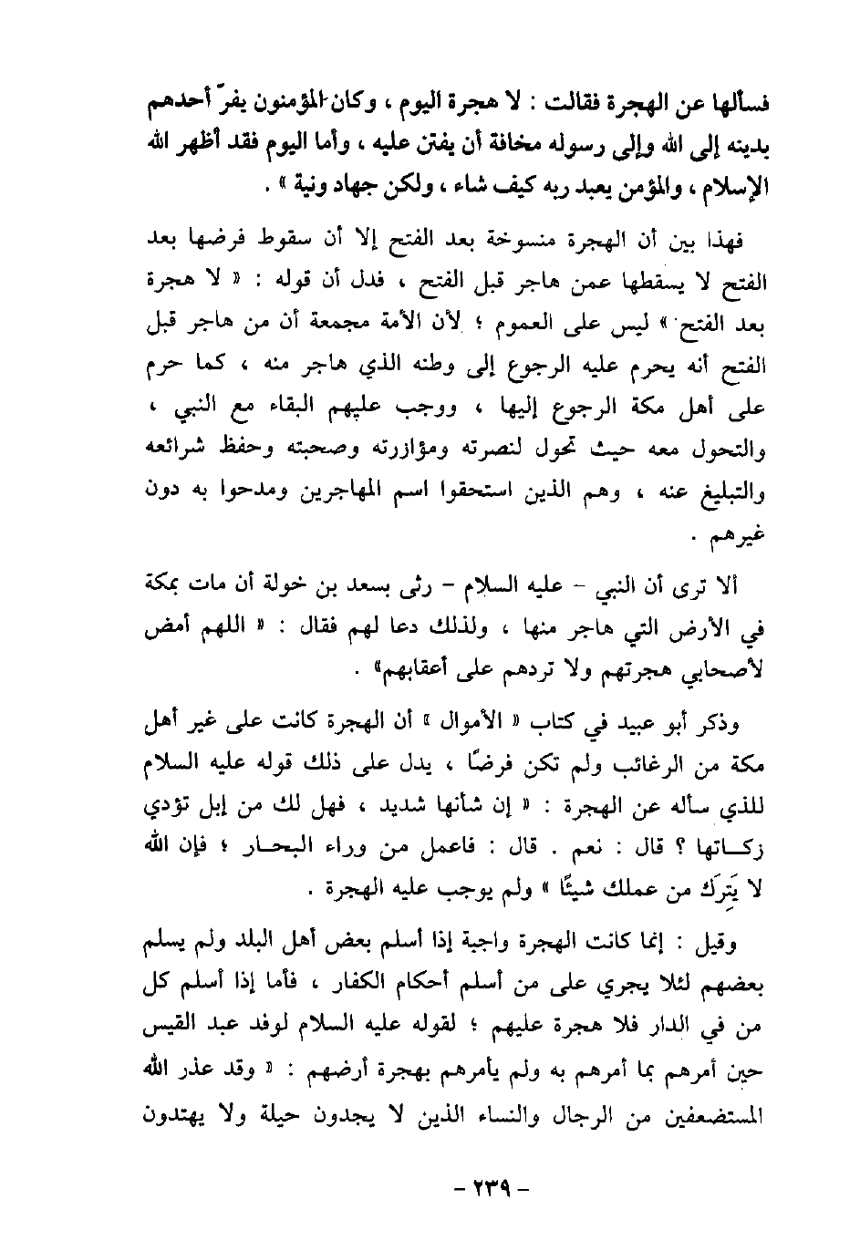 فَسَألها عن الْهِجْرَةِ، فَقَالَتْ: لاَ هِجْرَةَ اليوم، وَكَانَ المؤمنون يفر أحدهم بدينه إِلى اللَّه، وَإِلى رسوله مخافة أن يفتن عليه، وأما اليوم فقد أظهر الله الإِسْلامِ، وَالْمؤمن يعبد ربه كيف شاء، وَلكِنْ جِهَادٌ وَنِيَّةٌ. فهذا بين أن الهجرة منسوخة بعد الفتح إلا أن سقوط فرضها بعد الفتح لا يسقطها عمن هاجر قبل الفتح، فدل أن قوله: (لا هجرة بعد الفتح) ليس على العموم؛ لأن الأمة مجمعة أن من هاجر قبل الفتح أنه يحرم عليه الرجوع إلى وطنه الذى هاجر منه، كما حرم على أهل مكة الرجوع إليها، ووجب عليهم البقاء مع النبى، والتحول معه حيث تحول لنصرته ومؤازرته وصحبته وحفظ شرائعه والتبليغ عنه، وهم الذين استحقوا اسم المهاجرين ومدحوا به دون غيرهم. ألا ترى أن النبى (صلى الله عليه وسلم) رثى بسعد بن خولة أن مات بمكة فى الأرض التى هاجر منها، ولذلك دعا لهم فقال: (اللهم أمض لأصحابى هجرتهم ولا تردهم على أعقابهم) . وذكر أبو عبيد فى كتاب (الأموال) أن الهجرة كانت على غير أهل مكة من الرغائب ولم تكن فرضًا، يدل على ذلك قوله (صلى الله عليه وسلم) للذى سأله عن الهجرة: (إن شأنها شديد، فهل لك من إبل تؤدى زكاتها؟ قال: نعم. قال: فاعمل من وراء البحار؛ فإن الله لا يترك من عملك شيئًا) ولم يوجب عليه الهجرة. وقيل: إنما كانت الهجرة واجبة إذا أسلم بعض أهل البلد ولم يسلم بعضهم لئلا يجرى على من أسلم أحكام الكفار، فأما إذا أسلم كل من فى الدار فلا هجرة عليهم؛ لقوله (صلى الله عليه وسلم) لوفد عبد القيس حين أمرهم بما أمرهم به ولم يأمرهم بهجرة أرضهم: (وقد عذر الله المستضعفين من الرجال والنساء الذين لا يجدون حيلة ولا يهتدون