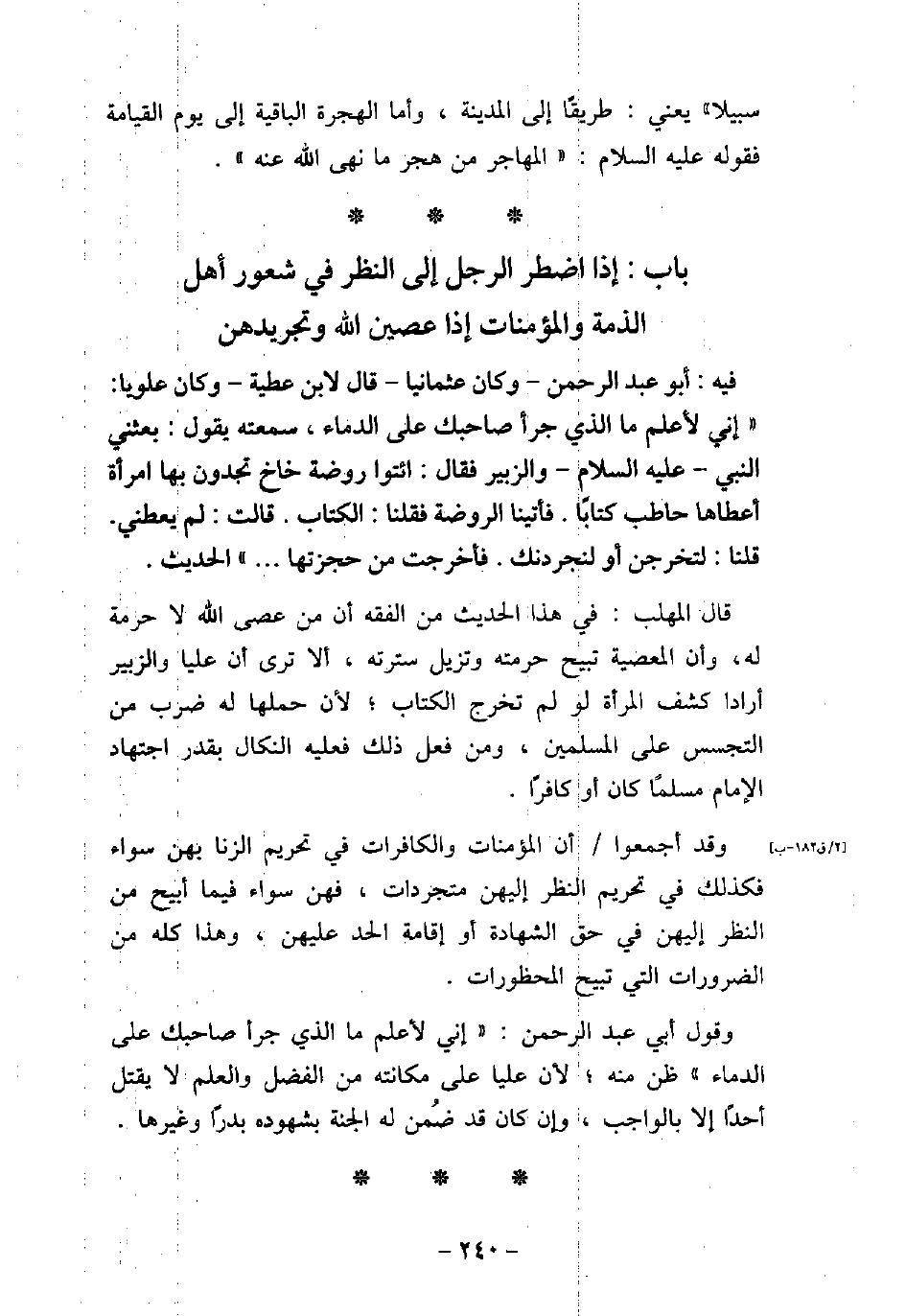 897 / فيه: أَبُو عَبْدِ الرَّحْمَنِ - وَكَانَ عُثْمَانِيًّا - قَالَ لابْنِ عَطِيَّةَ - وَكَانَ عَلَوِيًّا -: إِنِّى لأعْلَمُ مَا الَّذِى جَرَّأَ صَاحِبَكَ عَلَى الدِّمَاءِ، سَمِعْتُهُ يَقُولُ: بَعَثَنِى النَّبِىُّ، (صلى الله عليه وسلم) ، وَالزُّبَيْرَ، فَقَالَ: ائْتُوا رَوْضَةَ خاخ، تَجِدُونَ بِهَا امْرَأَةً أَعْطَاهَا حَاطِبٌ كِتَابًا، فَأَتَيْنَا الرَّوْضَةَ، فَقُلْنَا: الْكِتَابَ، قَالَتْ: لَمْ يُعْطِنِى، قُلْنَا: لَتُخْرِجِنَّ أَوْ لَنُجَرِّدَنَّكِ، فَأَخْرَجَتْ مِنْ حُجْزَتِهَا. . . . الحديث. قال المهلب: فى هذا الحديث من الفقه أن من عصى الله لا حرمة له، وأن المعصية تبيح حرمته وتزيل سترته، ألا ترى أن عليا والزبير أرادا كشف المرأة لو لم تخرج الكتاب؛ لأن حملها له ضرب من التجسس على المسلمين، ومن فعل ذلك فعليه النكال بقدر اجتهاد الإمام مسلمًا كان أو كافرًا. وقد أجمعوا أن المؤمنات والكافرات فى تحريم الزنا بهن سواء فكذلك فى تحريم النظر إليهن متجردات، فهن سواء فيما أبيح من النظر إليهن فى حق الشهادة أو إقامة الحد عليهن، وهذا كله من الضرورات التى تبيح المحظورات. وقول أبى عبد الرحمن: (إنى لأعلم ما الذى جرأ صاحبك على الدماء) ظن منه؛ لأن عليا على مكانته من الفضل والعلم لا يقتل أحدًا إلا بالواجب، وإن كان قد ضمن له الجنة بشهوده بدرًا وغيرها.