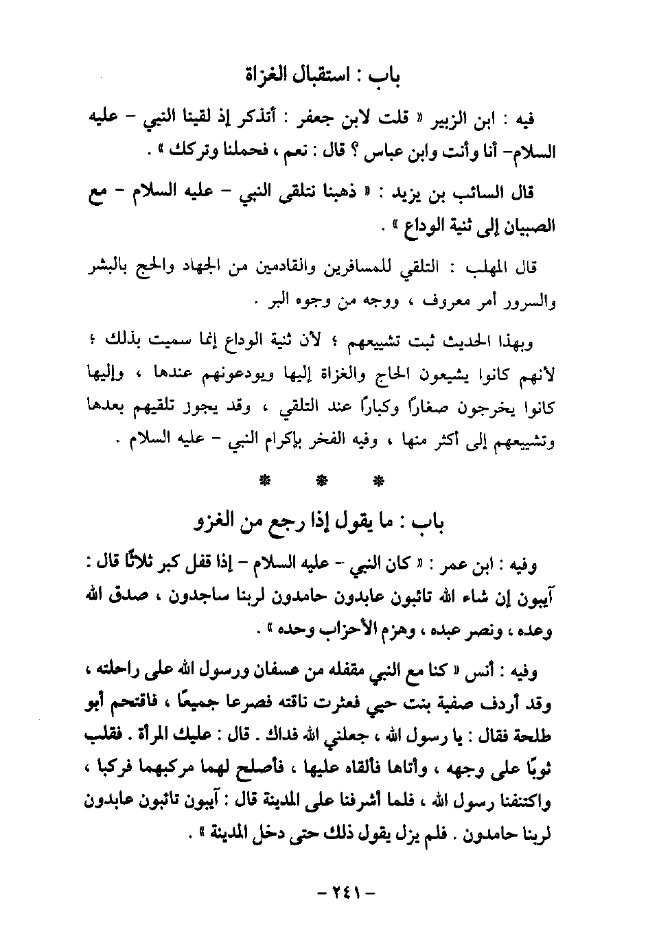 900 / وفيه: ابْن عُمَرَ، كَانَ النَّبِىّ، (صلى الله عليه وسلم) ، إِذَا قَفَلَ كَبَّرَ ثَلاثًا، قَالَ: (آيِبُونَ إِنْ شَاءَ اللَّهُ تَائِبُونَ عَابِدُونَ حَامِدُونَ لِرَبِّنَا سَاجِدُونَ، صَدَقَ اللَّهُ وَعْدَهُ، وَنَصَرَ عَبْدَهُ، وَهَزَمَ الأحْزَابَ وَحْدَهُ) . 1901 / وفيه: أَنَس، كُنَّا مَعَ النَّبِىِّ، (صلى الله عليه وسلم) ، مَقْفَلَهُ مِنْ عُسْفَانَ وَرَسُولُ اللَّهِ (صلى الله عليه وسلم) عَلَى رَاحِلَتِهِ، وَقَدْ أَرْدَفَ صَفِيَّةَ بِنْتَ حُيَىٍّ، فَعَثَرَتْ نَاقَتُهُ، فَصُرِعَا جَمِيعًا، فَاقْتَحَمَ أَبُو طَلْحَةَ، فَقَالَ: يَا رَسُولَ اللَّهِ، جَعَلَنِى اللَّهُ فِدَاءَكَ، قَالَ: (عَلَيْكَ الْمَرْأَةَ) ، فَقَلَبَ ثَوْبًا عَلَى وَجْهِهِ، وَأَتَاهَا فَأَلْقَاهُ عَلَيْهَا، وَأَصْلَحَ لَهُمَا مَرْكَبَهُمَا، فَرَكِبَا وَاكْتَنَفْنَا رَسُولَ اللَّهِ (صلى الله عليه وسلم) فَلَمَّا أَشْرَفْنَا عَلَى الْمَدِينَةِ، قَالَ: (آيِبُونَ تَائِبُونَ عَابِدُونَ لِرَبِّنَا حَامِدُونَ) ، فَلَمْ يَزَلْ يَقُولُ ذَلِكَ حَتَّى دَخَلَ الْمَدِينَةَ.