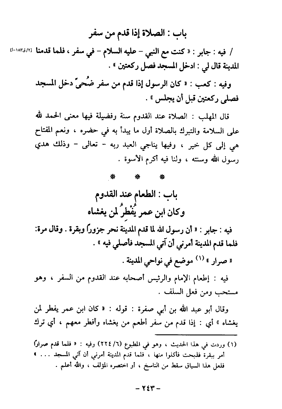 . 1904 / - فيه: جَابِر، أَنَّ رَسُولَ اللَّهِ (صلى الله عليه وسلم) لَمَّا قَدِمَ الْمَدِينَةَ، نَحَرَ جَزُورًا أَوْ بَقَرَةً. وقال مرة: فَلَمَا قَدِمَ الْمَدِينَةَ، أَمَرَنِى أَنْ آتِىَ الْمَسْجِدَ، فَأُصَلِّىَ فيه. (صرار) موضع فى نواحى المدينة. فيه: إطعام الإمام والرئيس أصحابه عند القدوم من السفر، وهو مستحب ومن فعل السلف. وقال أبو عبد الله بن أبى صفرة: قوله: (كان ابن عمر يفطر لمن يغشاه) أى: إذا قدم من سفر أطعم من يغشاه وأفطر معهم، أى ترك