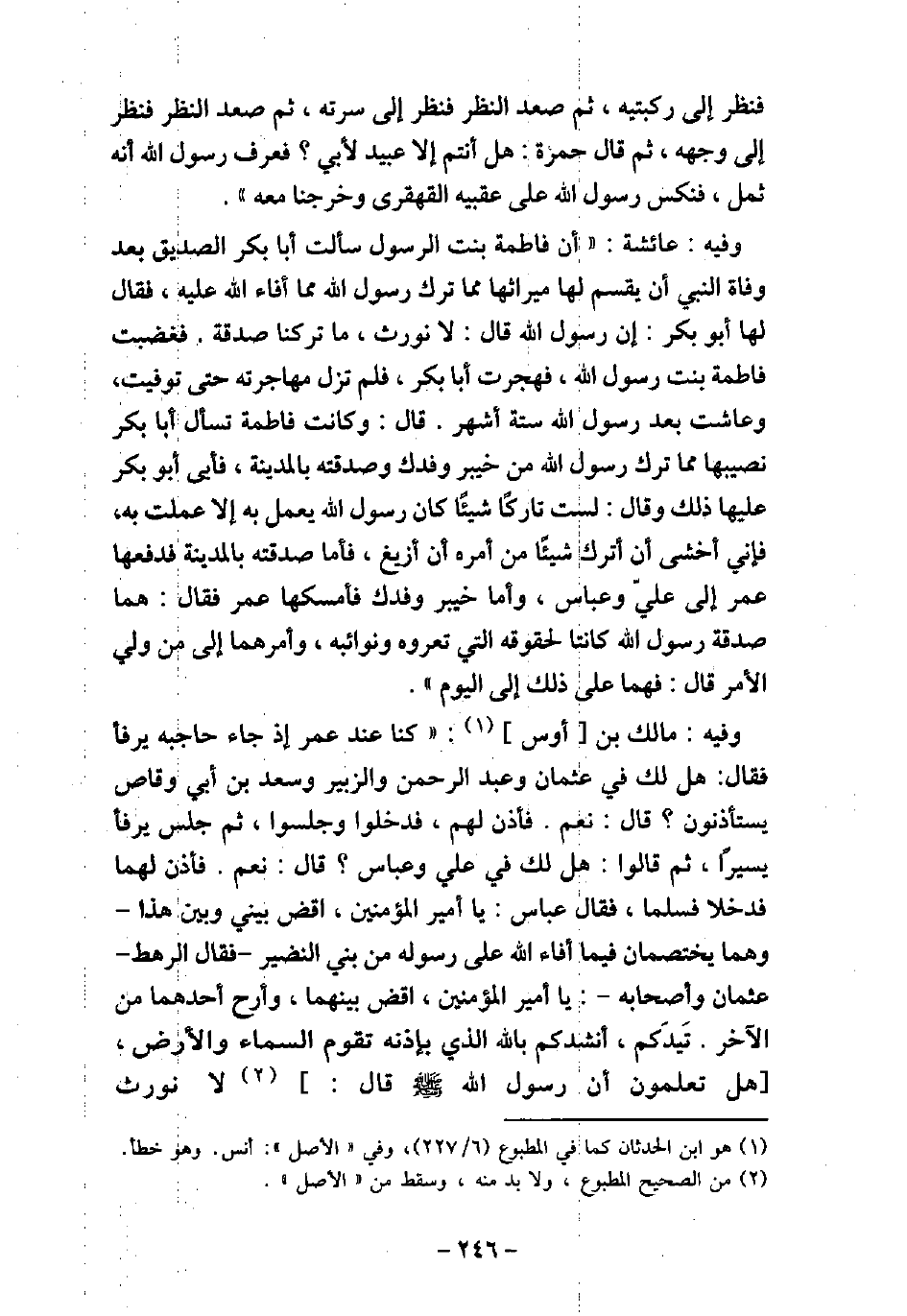فَنَظَرَ إِلَى رُكْبَتِهِ، ثُمَّ صَعَّدَ النَّظَرَ، فَنَظَرَ إِلَى سُرَّتِهِ، ثُمَّ صَعَّدَ النَّظَرَ، فَنَظَرَ إِلَى وَجْهِهِ، ثُمَّ قَالَ حَمْزَةُ: هَلْ أَنْتُمْ إِلا عَبِيدٌ لأبِى، فَعَرَفَ رَسُولُ اللَّهِ (صلى الله عليه وسلم) أَنَّهُ قَدْ ثَمِلَ، فَنَكَصَ رَسُولُ اللَّهِ (صلى الله عليه وسلم) عَلَى عَقِبَيْهِ الْقَهْقَرَى، وَخَرَجْنَا مَعَهُ. 1906 / وفيه: عَائِشَةَ، أَنَّ فَاطِمَةَ بنَت الرسول سَأَلَتْ أَبَا بَكْرٍ الصِّدِّيقَ بَعْدَ وَفَاةِ النَّبِى (صلى الله عليه وسلم) أَنْ يَقْسِمَ لَهَا مِيرَاثَهَا، مِمَّا تَرَكَ رَسُولُ اللَّهِ (صلى الله عليه وسلم) مِمَّا أَفَاءَ اللَّهُ عَلَيْهِ، فَقَالَ لَهَا أَبُو بَكْرٍ: إِنَّ رَسُولَ اللَّهِ (صلى الله عليه وسلم) قَالَ: (لا نُورَثُ،