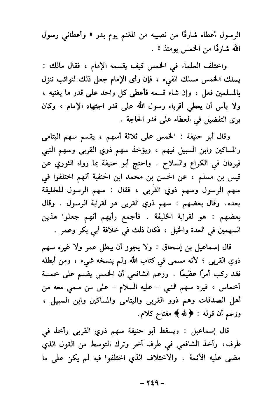 الرسول أعطاه شارفًا من نصيبه من المغنم يوم بدر (وأعطانى رسول الله شارفًا من الخمس يومئذ) . واختلف العلماء فى الخمس كيف يقسمه الإمام، فقال مالك: يسلك الخمس مسلك الفيء، فإن رأى الإمام جعل ذلك لنوائب تنزل بالمسلمين فعل، وإن شاء قسمه فأعطى كل واحد على قدر ما يغنيه، ولا بأس أن يعطى أقرباء رسول الله على قدر اجتهاد الإمام، وكان يرى التفضيل فى العطاء على قدر الحاجة. وقال أبو حنيفة: الخمس على ثلاثة أسهم، يقسم سهم اليتامى والمساكين وابن السبيل فيهم، ويؤخذ سهم ذوى القربى وسهم النبى فيردان فى الكراع والسلاح. واحتج أبو حنيفة بما رواه الثورى عن قيس بن مسلم، عن الحسن بن محمد ابن الحنفية أنهم اختلفوا فى سهم الرسول وسهم ذوى القربى، فقال: سهم الرسول للخليفة بعده. وقال بعضهم: سهم ذوى القربى هو لقرابة الرسول. وقال بعضهم: هو لقرابة الخليفة. فأجمع رأيهم أنهم جعلوا هذين السهمين فى العدة والخيل، فكان ذلك فى خلافة أبى بكر وعمر. قال إسماعيل بن إسحاق: ولا يجوز أن يبطل عمر ولا غيره سهم ذوى القربى؛ لأنه مسمى فى كتاب الله ولم ينسخه شيء، ومن أبطله فقد ركب أمرًا عظيمًا. وزعم الشافعى أن الخمس يقسم على خمسة أخماس، فيرد سهم النبى (صلى الله عليه وسلم) على من سمى معه من أهل الصدقات وهم ذوو القربى واليتامى والمساكين وابن السبيل، وزعم أن قوله: (لله (مفتاح كلام. قال إسماعيل: ويسقط أبو حنيفة سهم ذوى القربى وأخذ فى طرف، وأخذ الشافعى فى طرف آخر وترك التوسط من القول الذى مضى عليه الأئمة. والاختلاف الذى اختلفوا فيه لم يكن على ما