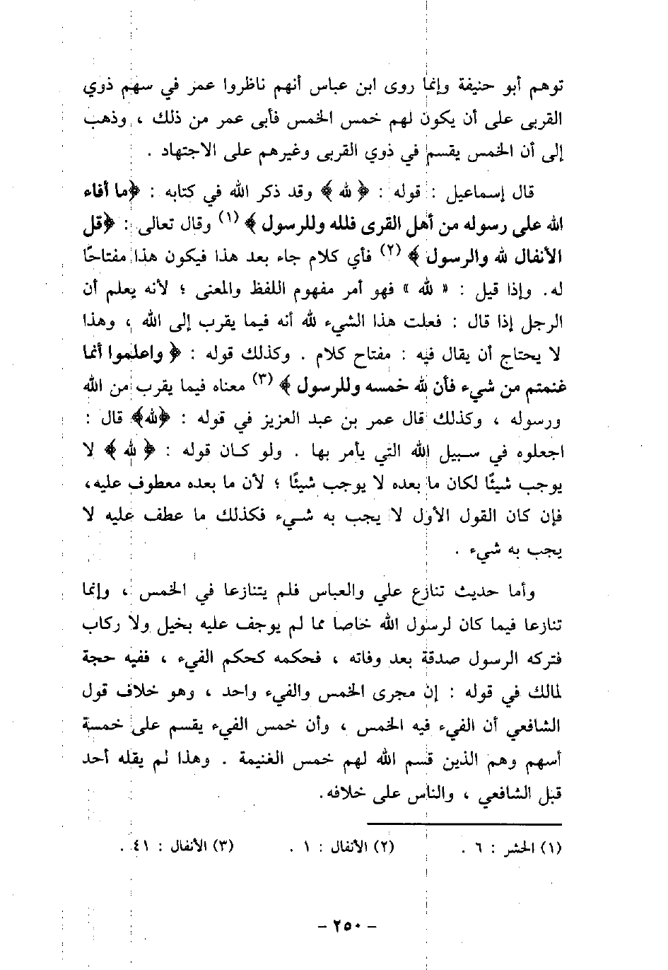 توهم أبو حنيفة وإنما روى ابن عباس أنهم ناظروا عمر فى سهم ذوى القربى على أن يكون لهم خمس الخمس فأبى عمر من ذلك، وذهب إلى أن الخمس يقسم فى ذوى القربى وغيرهم على الاجتهاد. قال إسماعيل: قوله: (لله (وقد ذكر الله فى كتابه: (ما أفاء الله على رسوله من أهل القرى فلله وللرسول (وقال تعالى: (قل الأنفال لله والرسول (فأى كلام جاء بعد هذا فيكون هذا مفتاحًا له. وإذا قيل: (لله) فهو أمر مفهوم اللفظ والمعنى؛ لأنه يعلم أن الرجل إذا قال: فعلت هذا الشيء لله أنه فيما يقرب إلى الله، وهذا لا يحتاج أن يقال فيه: مفتاح كلام. وكذلك قوله: (واعلموا أنما غنمتم من شيء فأن لله خمسه وللرسول (معناه فيما يقرب من الله ورسوله، وكذلك قال عمر بن عبد العزيز فى قوله: (لله (قال: اجعلوه فى سبيل الله التى يأمر بها، ولو كان قوله: (الله (لا يوجب شيئًا لكان ما بعده لا يوجب شيئًا؛ لأن ما بعده معطوف عليه، فإن كان القول الأول لا يجب به شيء فكذلك ما عطف عليه لا يجب به شيء. وأما حديث تنازع على والعباس فلم يتنازعا فى الخمس، وإنما تنازعا فيما كان لرسول الله خاصا مما لم يوجف عليه بخيل ولاركاب فتركه الرسول صدقة بعد وفاته، فحكمه كحكم الفيء، ففيه حجة لمالك فى قوله: إن مجرى الخمس والفئ واحد، وهو خلاف قول الشافعى أن الفئ فيه الخمس، وأن خمس الفيء يقسم على خمسة أسهم وهم الذين قسم الله لهم خمس الغنيمة. وهذا لم يقله أحد قبل الشافعى، والناس على خلافه.