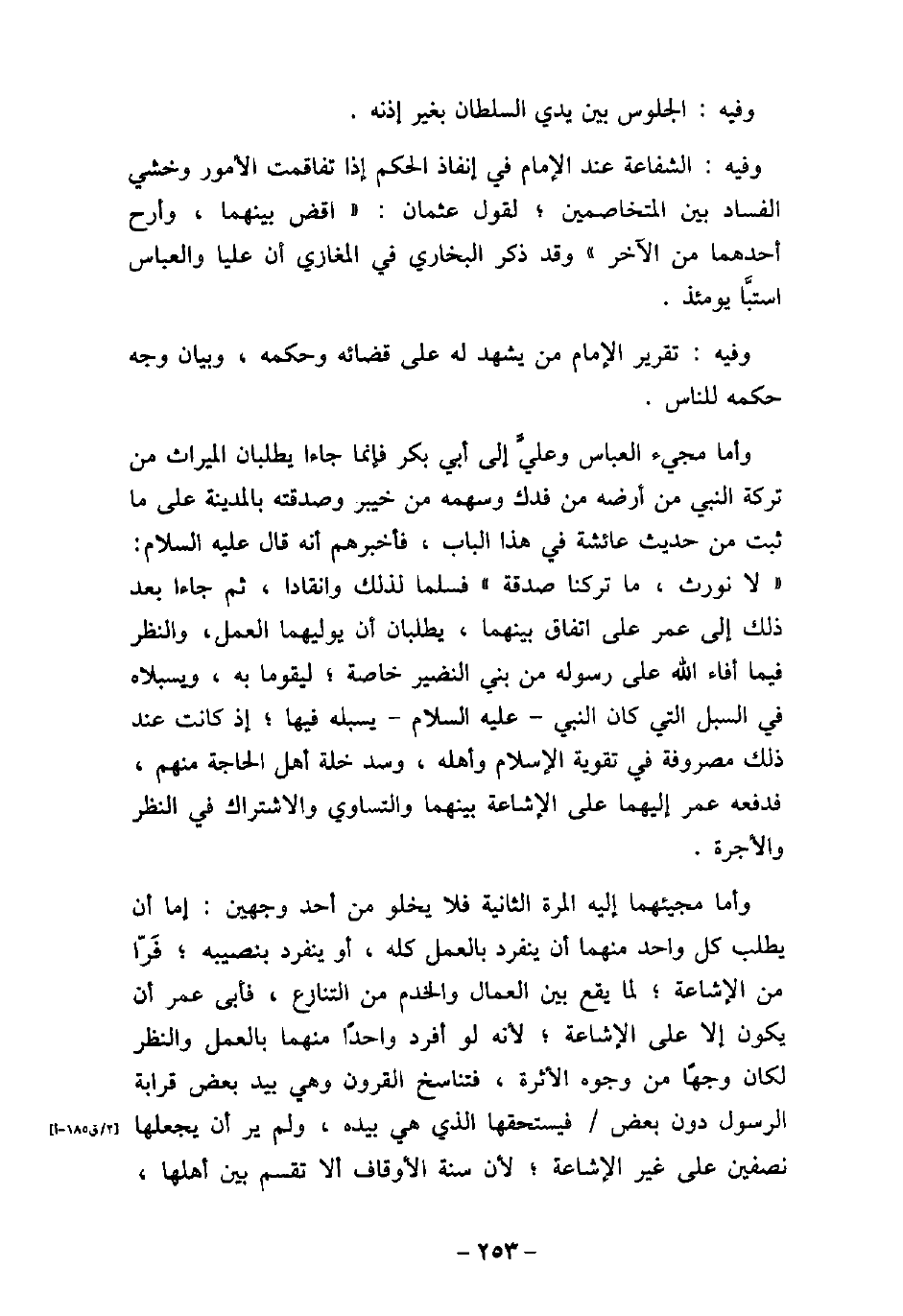 وفيه: الجلوس بين يدى السلطان بغير إذنه. وفيه: الشفاعة عند الإمام فى إنفاذ الحكم إذا تفاقمت الأمور وخشى الفساد بين المتخاصمين؛ لقول عثمان: (اقض بينهما، وأرح أحدهما من الآخر) وقد ذكر البخارى فى المغازى أن عليا والعباس استبا يومئذ. وفيه: تقرير الإمام من يشهد له على قضائه وحكمه، وبيان وجه حكمه للناس. وأما مجيء العباس وعلى إلى أبى بكر فإنما جاءا يطلبان الميراث من تركة النبى من أرضه من فدك وسهمه من خيبر وصدقته بالمدينة على ما ثبت من حديث عائشة فى هذا الباب، فأخبرهم أنه قال (صلى الله عليه وسلم) : (لا نورث، ما تركنا صدقة) فسلما لذلك وانقادا، ثم جاءا بعد ذلك إلى عمر على اتفاق بينهما، يطلبان أن يوليهما العمل، والنظر فيما أفاء الله على رسوله من بنى النضير خاصة؛ ليقوما به، ويسبلاه فى السبل التى كان النبى (صلى الله عليه وسلم) يسبله فيها؛ إذ كانت عند ذلك مصروفة فى تقوية الإسلام وأهله، وسد خلة أهل الحاجة منهم، فدفعه عمر إليهما على الإشاعة بينهما والتساوى والاشتراك فى النظر والأجرة. وأما مجيئهما إليه المرة الثانية فلا يخلو من أحد وجهين إما أن يطلب كل واحد منهما أن ينفرد بالعمل كله، أو ينفرد بنصيبه؛ فرا من الإشاعة؛ لما يقع بين العمال والخدم من التنازع، فأبى عمر أن يكون إلا على الإشاعة؛ لأنه لو أفرد واحدًا منهما بالعمل والنظر لكان وجهًا من وجوه الأثرة، فتناسخ القرون وهى بيد بعض قرابة الرسول دون بعض فيستحقها الذى هى بيده، ولم ير أن يجعلها نصفين على غير الإشاعة؛ لأن سنة الأوقاف ألا تقسم بين أهلها،
